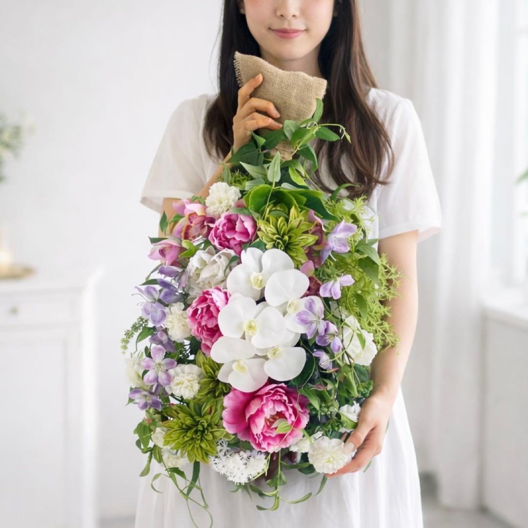 選び抜かれた純白の胡蝶蘭、そして圧倒的な存在感を放つ大輪の牡丹を贅沢に配した、最高級ラインの特大スワッグです。