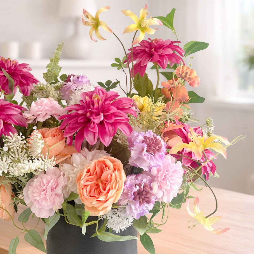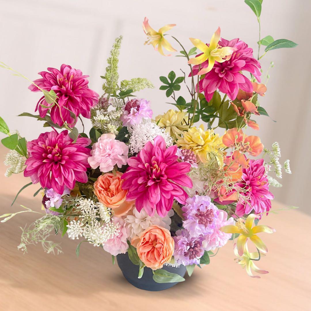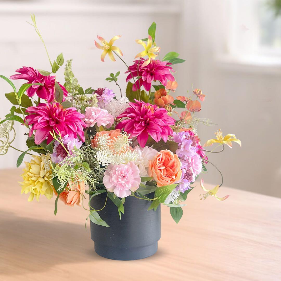 母の日 「プレステージ・サン」鮮烈なダリアとオールドローズの豪華モダンアレンジ アーティフィシャルフラワー
