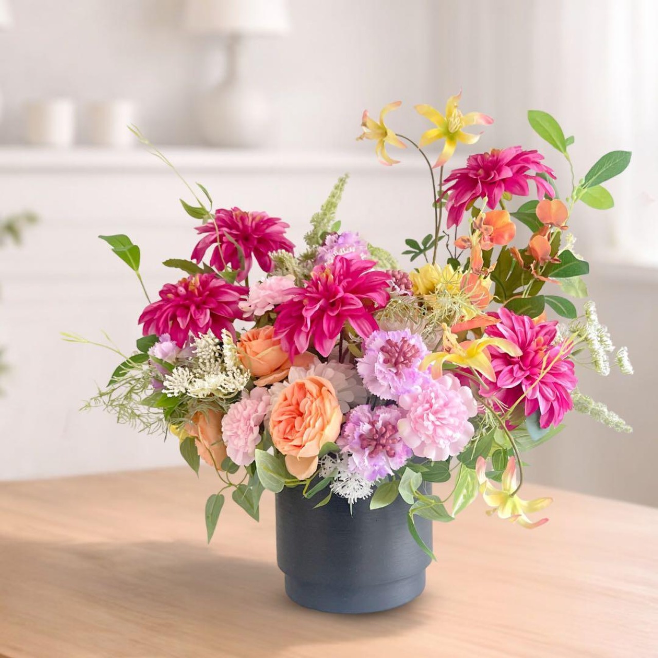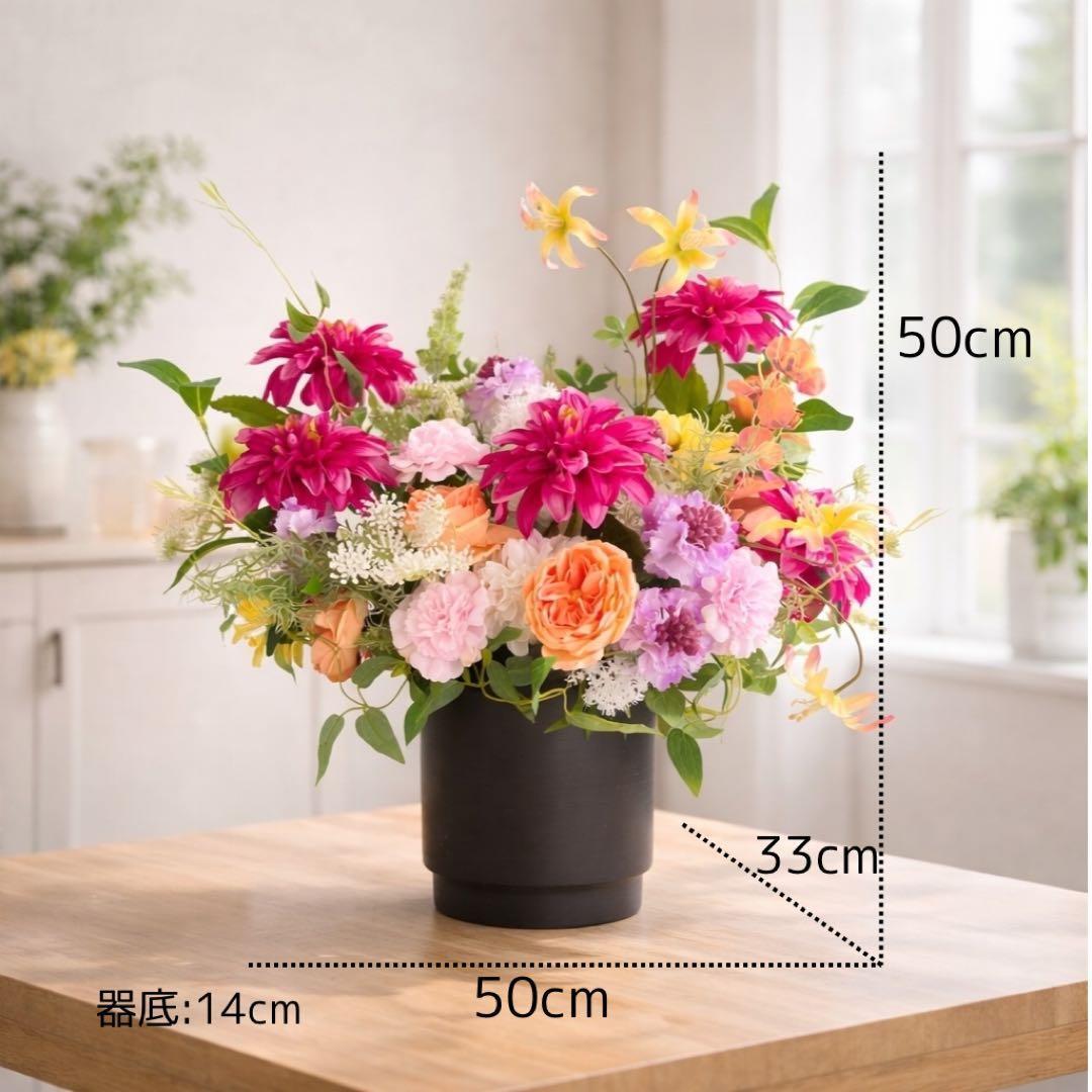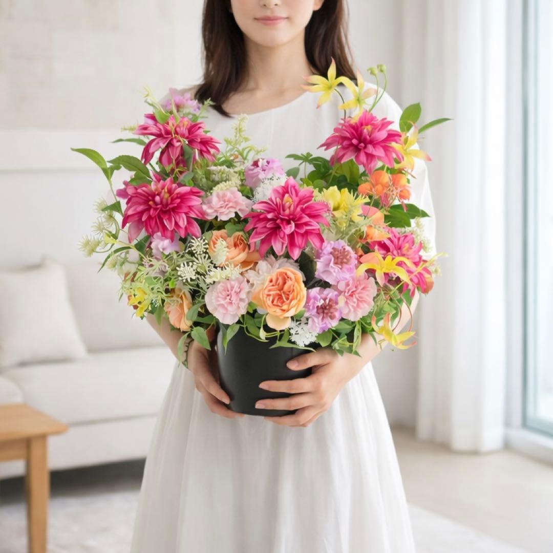 母の日 「プレステージ・サン」鮮烈なダリアとオールドローズの豪華モダンアレンジ アーティフィシャルフラワー