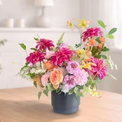目の覚めるような鮮やかなダリアを中心に、温かみのあるオレンジのオールドローズや、優美なカーネーションを贅沢に詰め込んだ華やかなアレンジメントです。