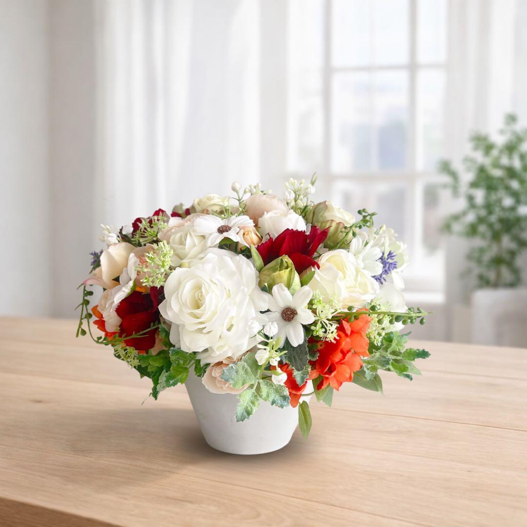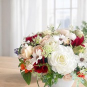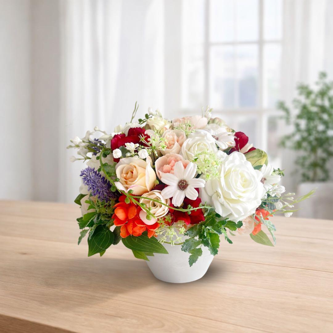 純白の大きな薔薇を中心に、多彩な小花を器いっぱいに咲かせた、宝石箱のようなアレンジメントです。