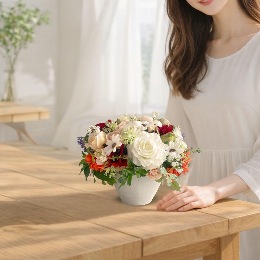 枯れない高品質なアーティフィシャルフラワーを使用しているため、水換えや掃除の負担が一切ありません。