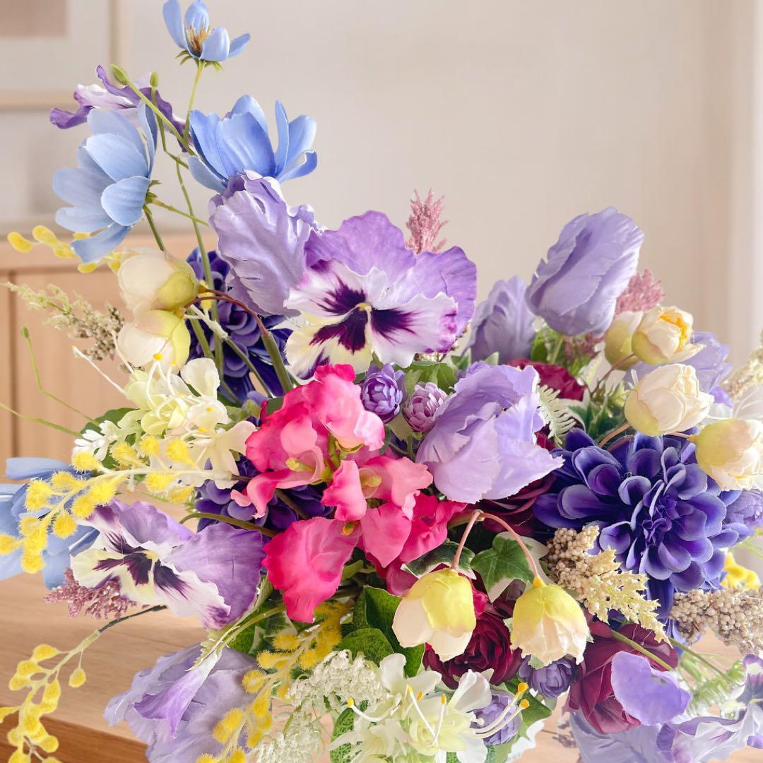 今季のメインは、アーティフィシャルフラワーならではの繊細な表情が美しい「パンジー」そこに華やかなダリア、空を舞うようなスナップドラゴン、そしてそよそよと揺れるコスモスやミモザ、野薔薇を贅沢に織り交ぜました。