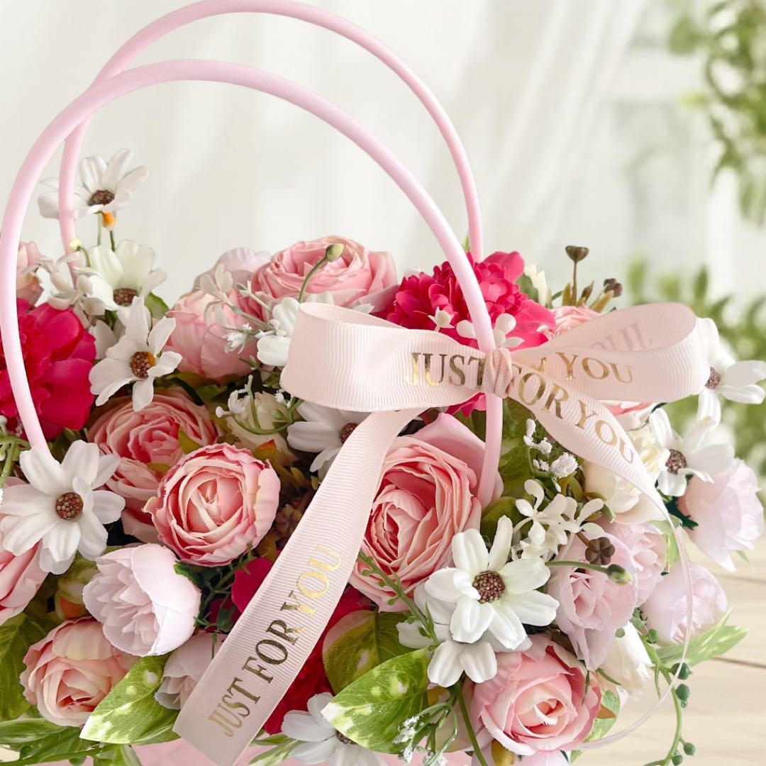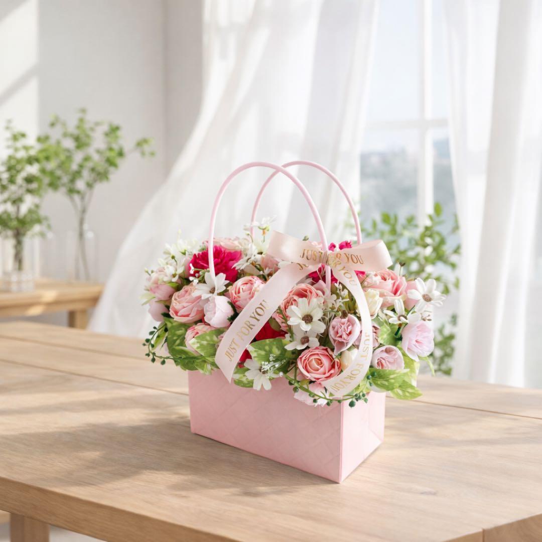 まるで本物のバッグのように持ち手がついた、人気のバッグ型フラワーアレンジメントです。