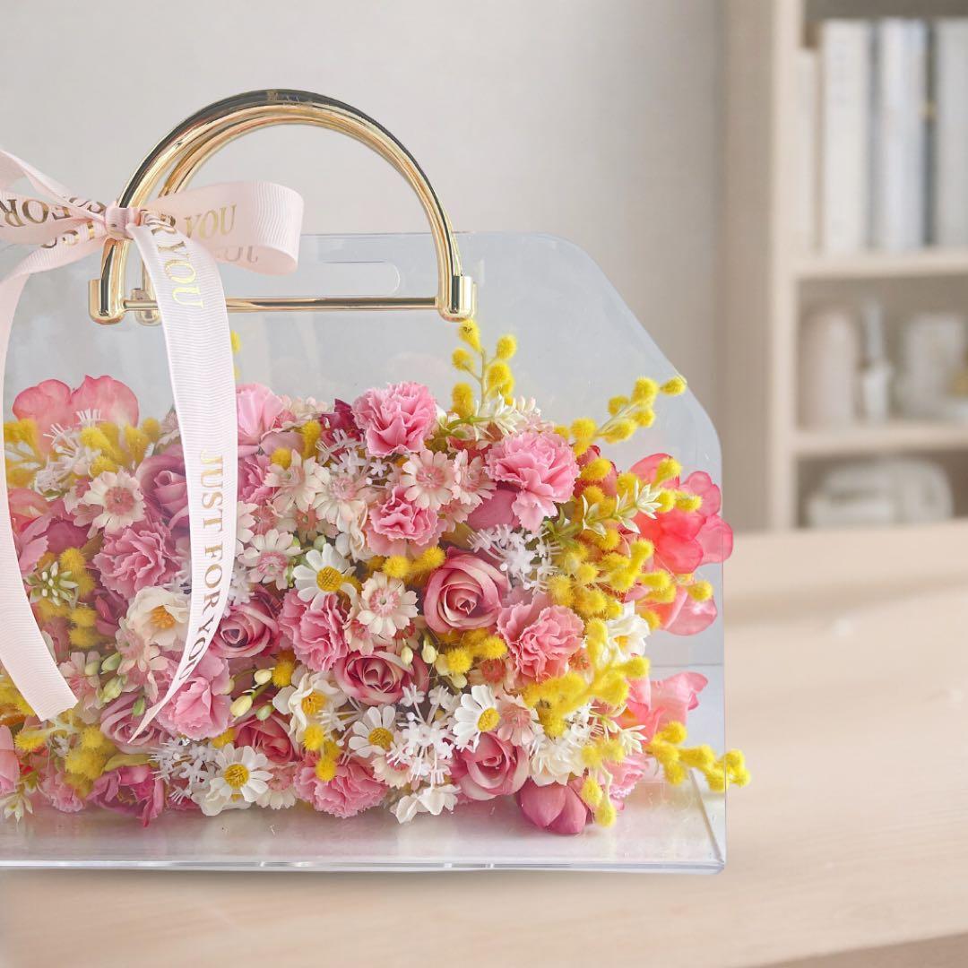 【母の日プレミアム】光触媒フラワー「クリスタル・フルール・バッグ」薔薇とミモザの最高級クリアアレンジ 贈り物 アーティフィシャルフラワー