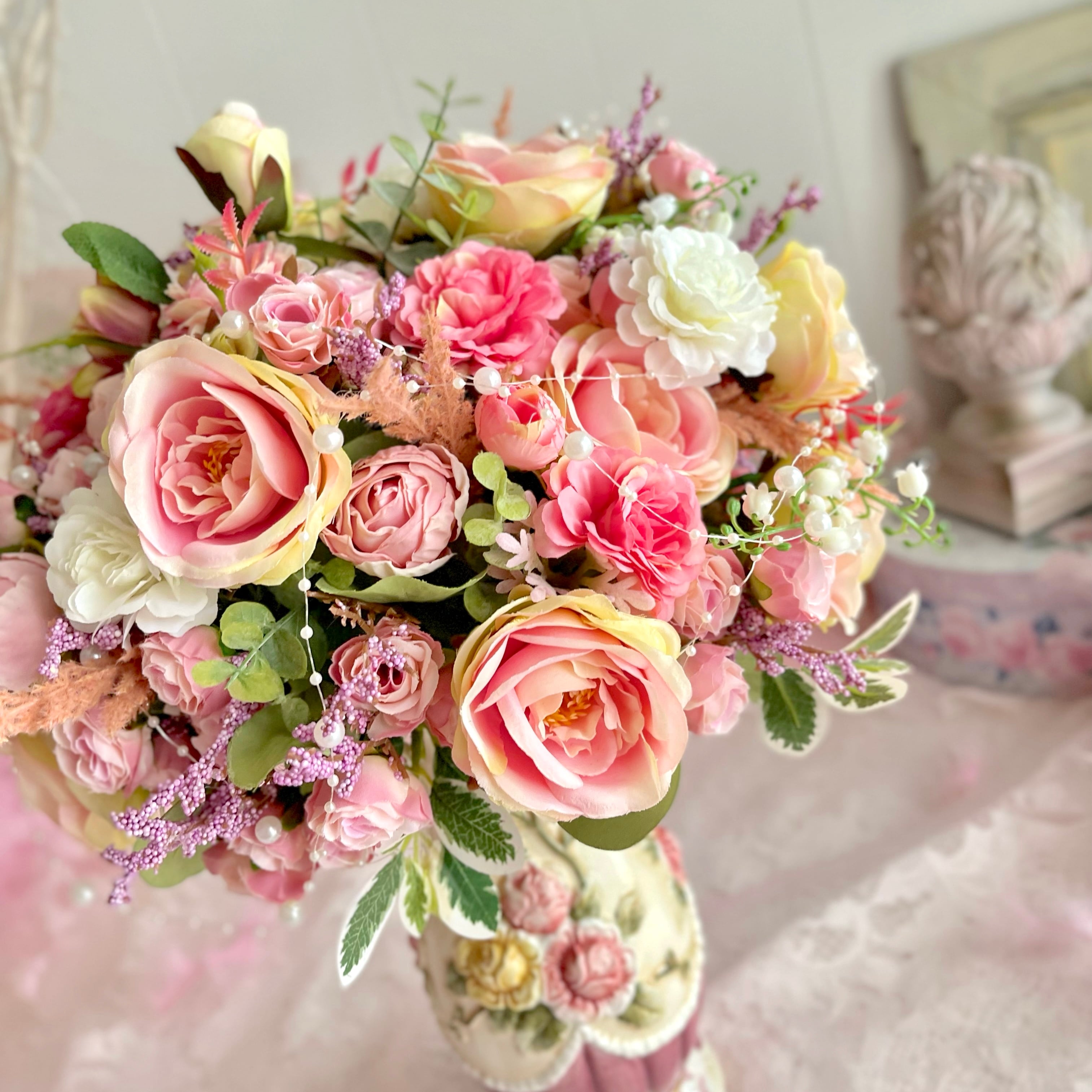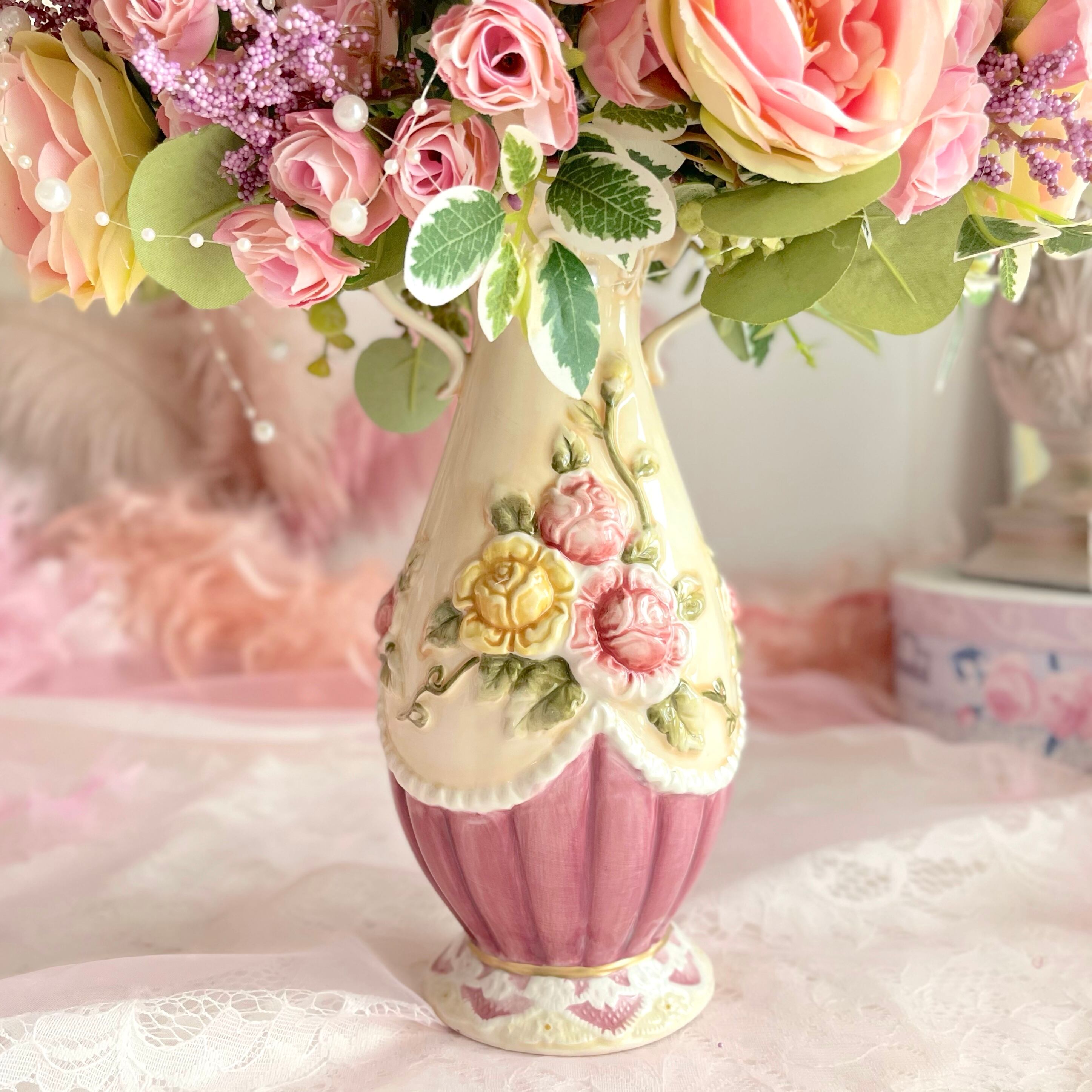 思いっきりメルヘンなフラワーベースに、お花と物語をのせて、数種類の薔薇を咲かせた可愛いデザインしました♡