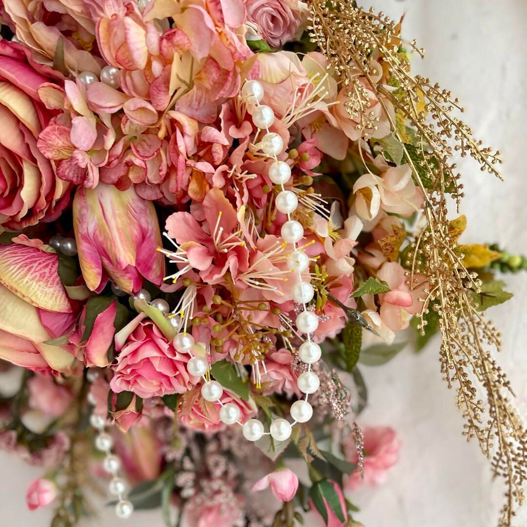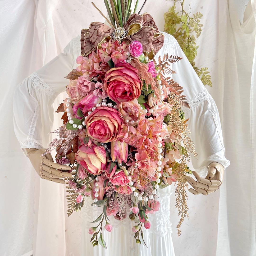 存在感あふれるフェアリーピンクのオールドローズに、季節のチューリップや、ドライスタイルのローズやアジサイを咲かせ、アンティーク感が可愛いビジュー付きのベロアリボンで束ね、パールを纏った豪華なヨーロピアンスタイルのスワッグで、エレガントな雰囲気を演出します☆