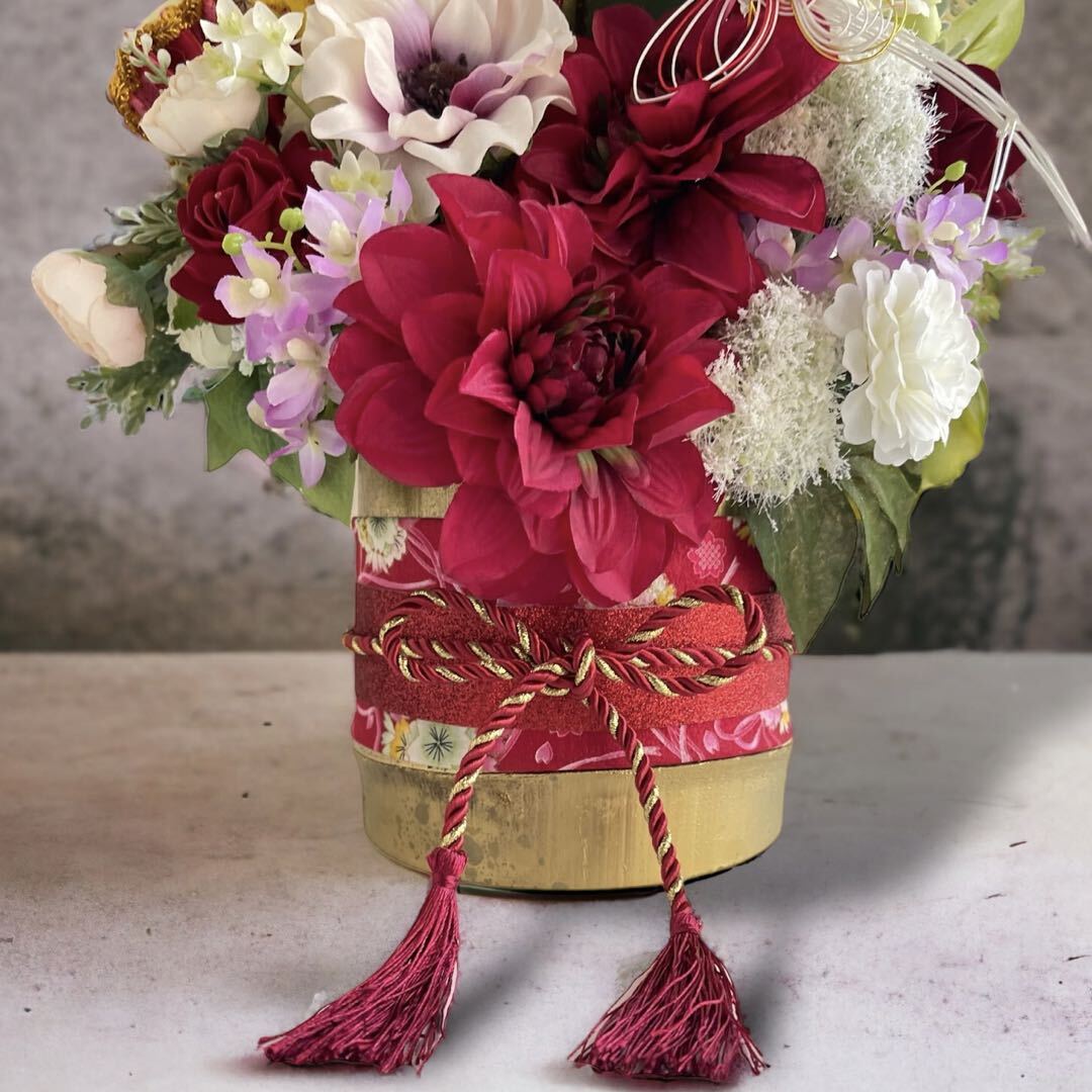 お正月らしく松や椿や紅葉を咲かせながら、メインには華やかなクラシカルなダリア咲き誇る、和洋の組み合わせの調和が美しいデザインを完成させました。
