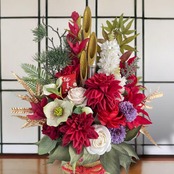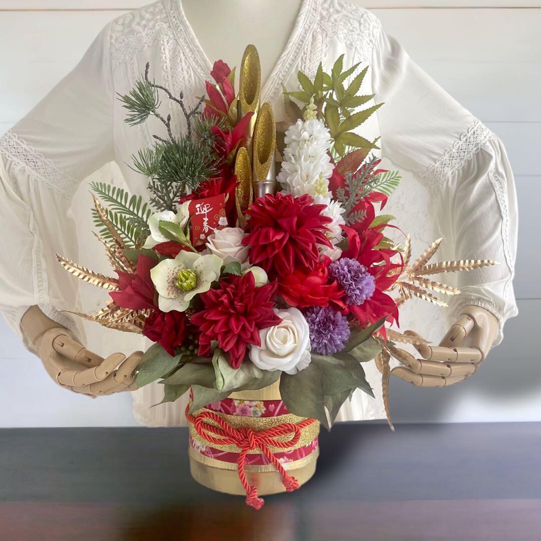 目を惹く程よいサイズ感や、こだわりの天然の竹のベースに、松や蘭やダリアやマムなどお正月らしい華やかなお花を満開に咲かせました。