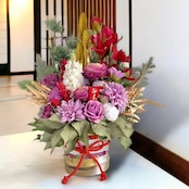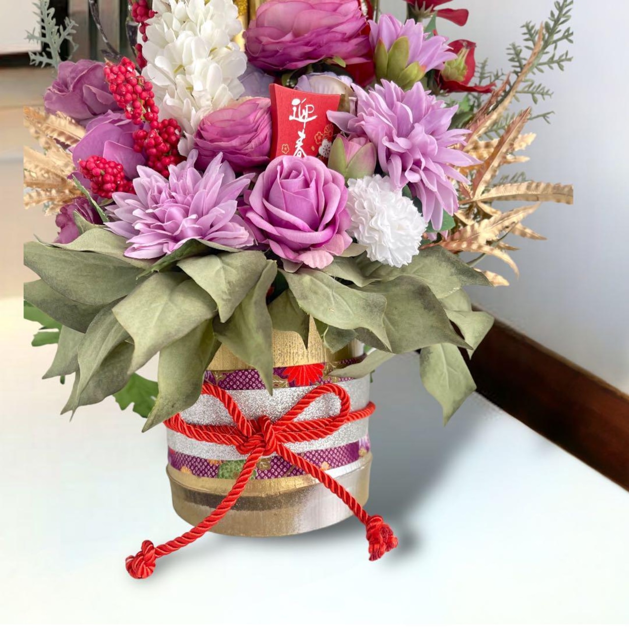 目を惹く程よいサイズ感や、こだわりの天然の竹のベースに、松や蘭やダリアやマムなどお正月らしい華やかなお花を満開に咲かせました。