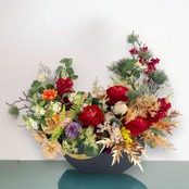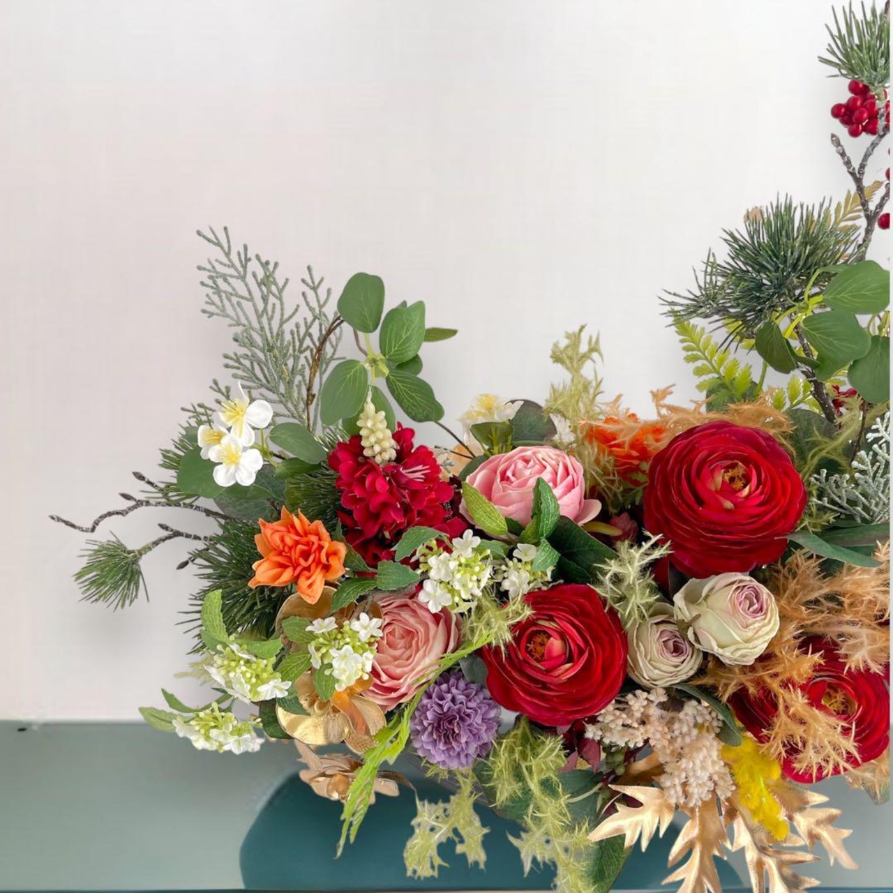 幾重にも重なる花びらが美しい真紅のラナンキュラスをメインに、繊細なコデマリを流し、新年らしく松やゴールドの胡蝶蘭、マムや千両を添えた華やかなデザインです。