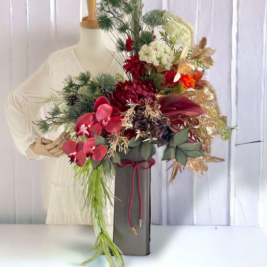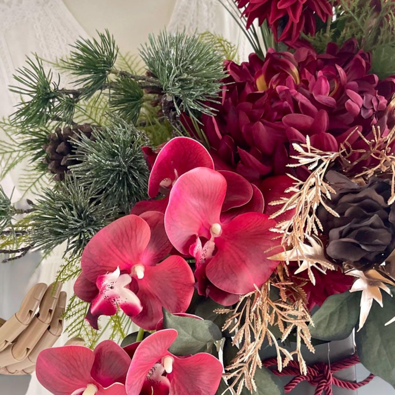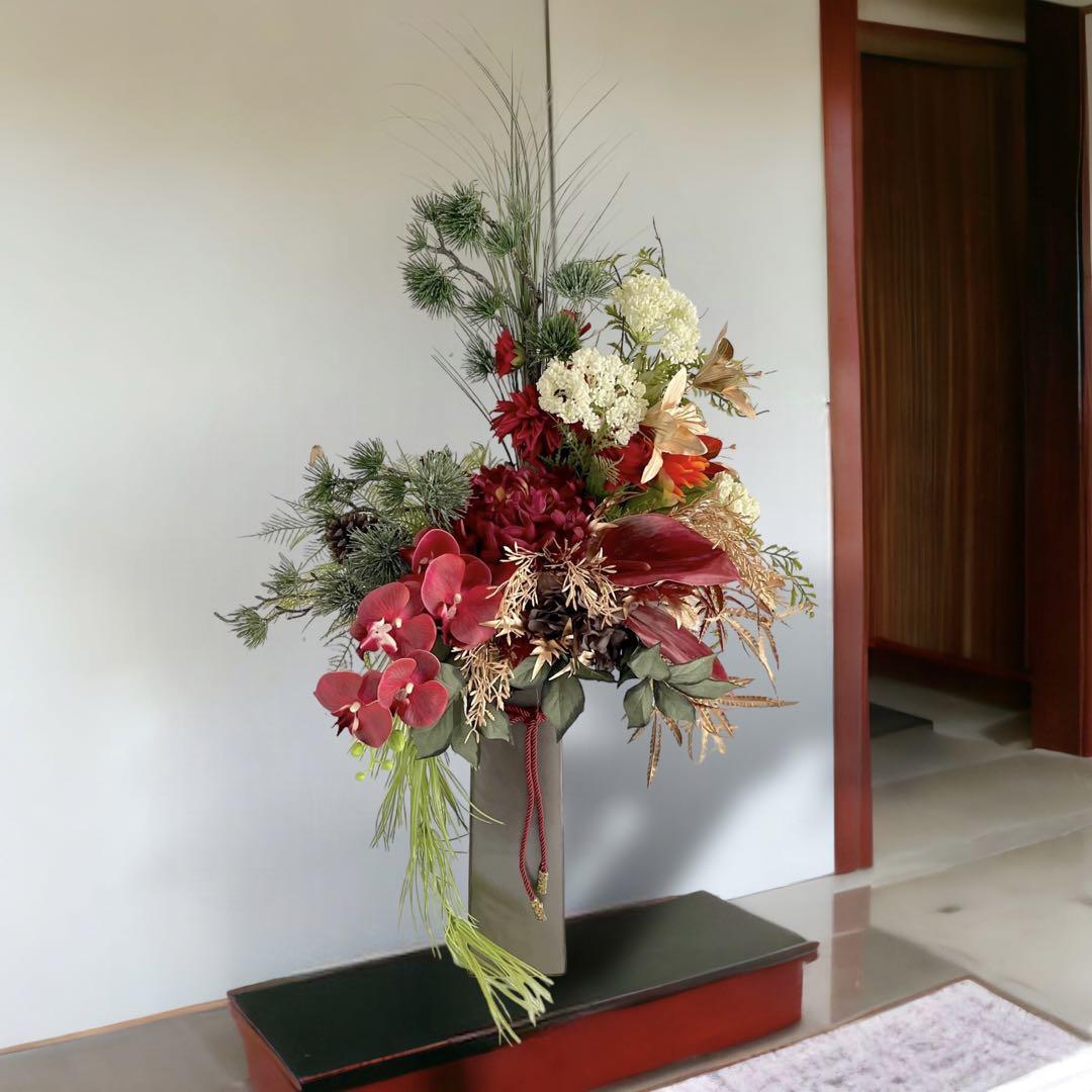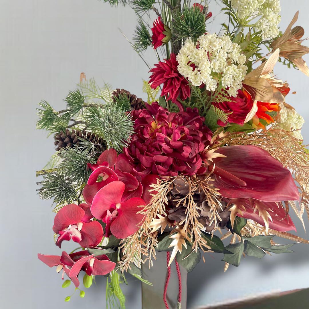 高級花材の松や胡蝶蘭、菊やアンスリウムなど、大ぶりで大胆なアーティフィシャルフラワーをふんだんに使用しました。
