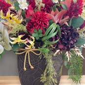 モダンでオシャレなブラックの花器に高級な胡蝶蘭に百合、クラシカルな紫陽花にお正月らしくダリアや松やゴールドリリーを添えました。