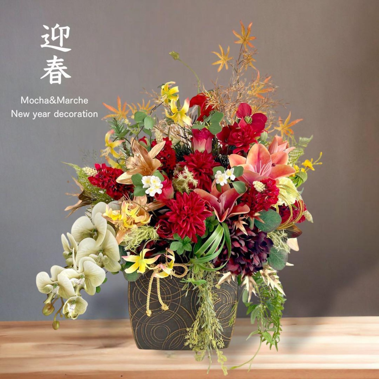 心までも明るくしてくれる高級花材の鮮やかな色合いが、きらびやかな正月を豪華に演出してくれます。