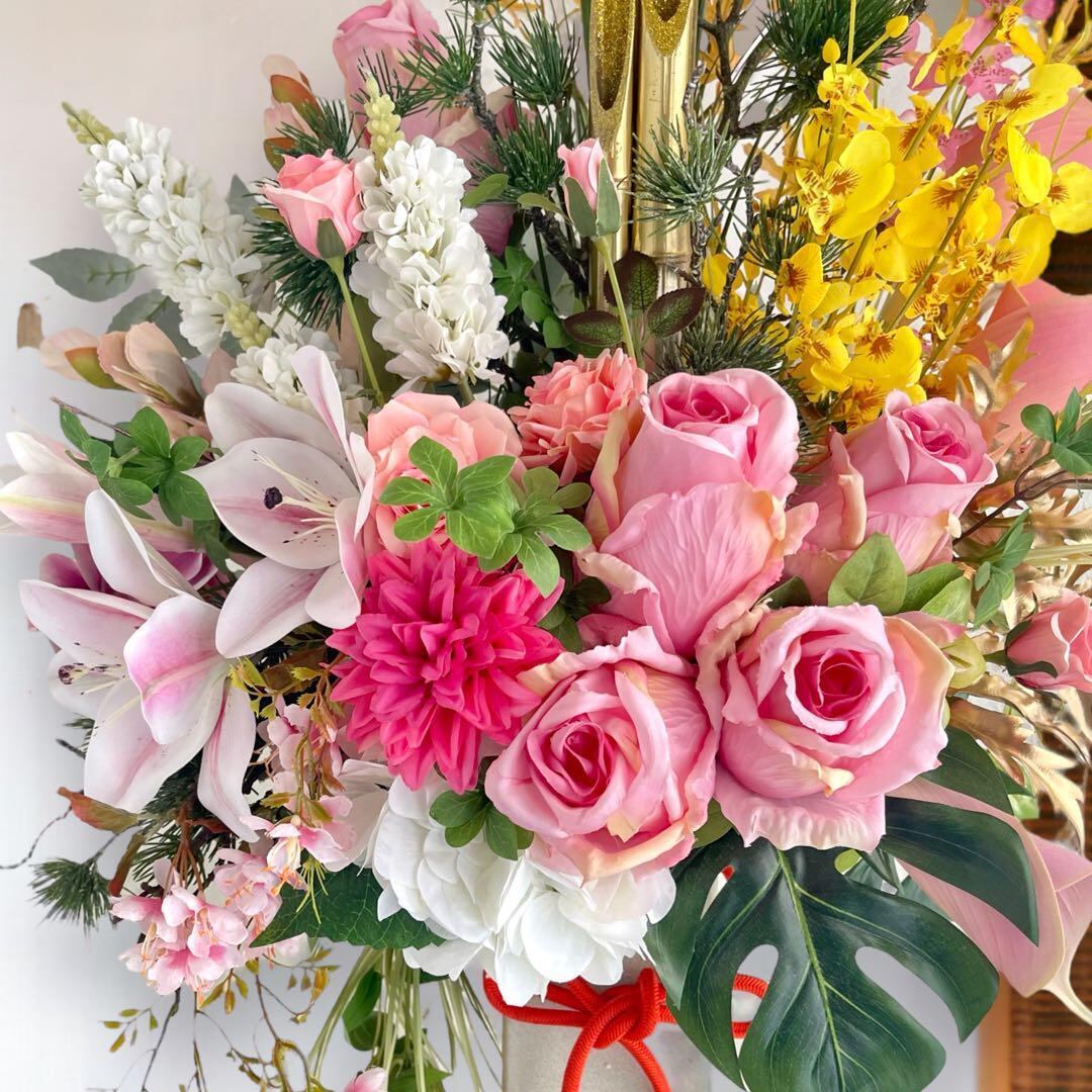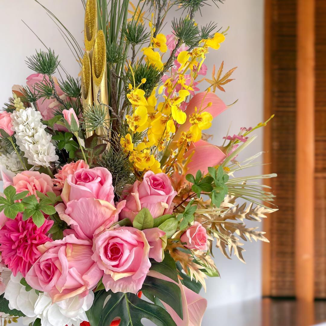 竹を慎重に選び、組み合わせ、塗装しデザインして飾りつけ、特大のオールドローズに、百合、タリアに松にオンシジウムなど華やかに咲かせました。