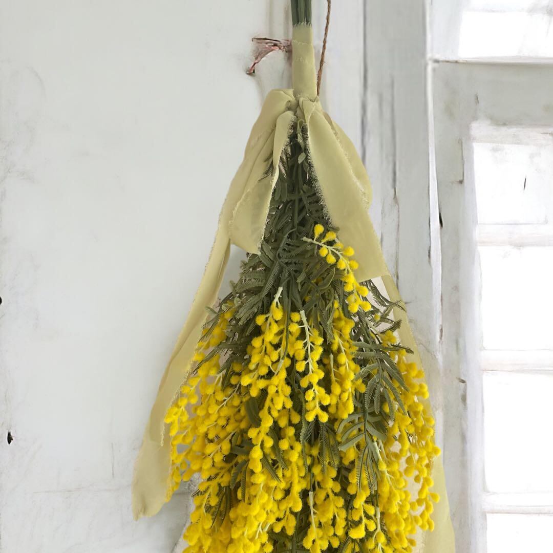 春の訪れを感じさせてくれる、人気のイエローのミモザをシンプルに束ねた、スタイリッシュな90cmのアーティフィシャルフラワー(造花)のスワッグです。