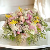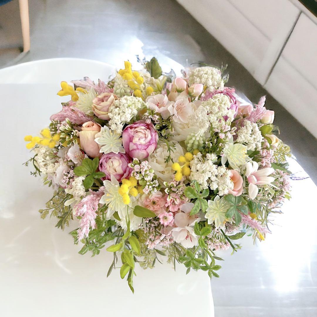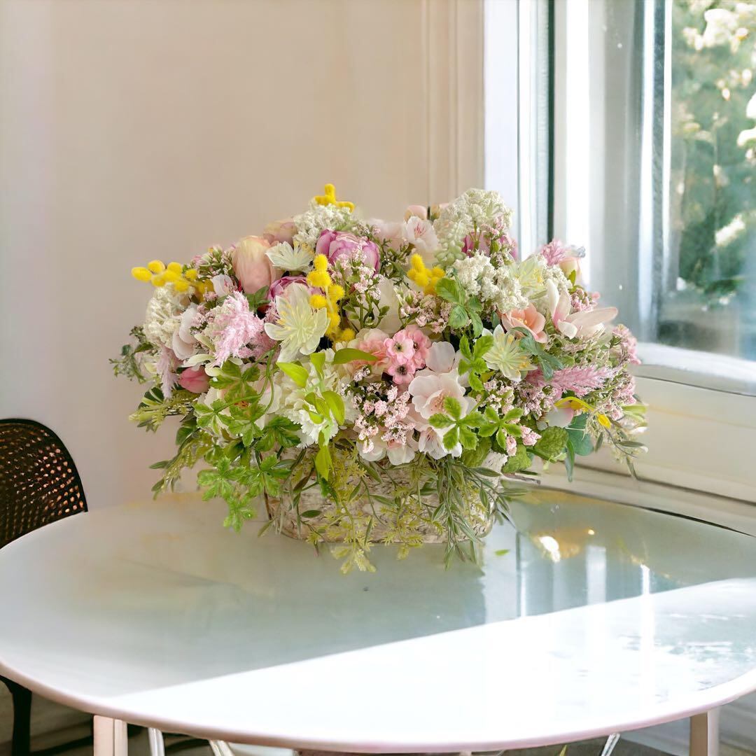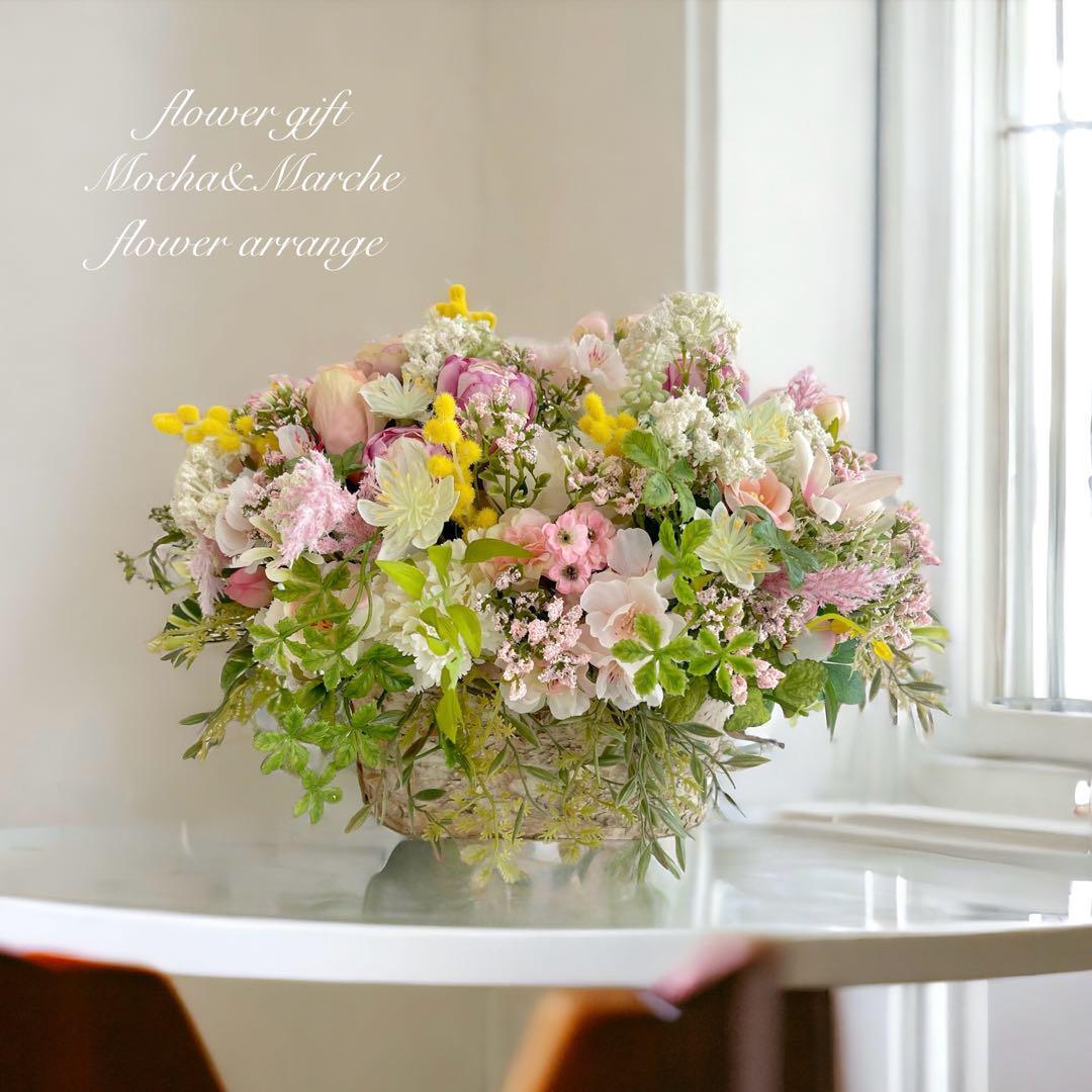 バスケットに優雅に咲くチューリップや桜、カーネーションやミモザ、アストランティアやミニローズなど多彩な草花が繊細で優しい雰囲気を演出しています。
