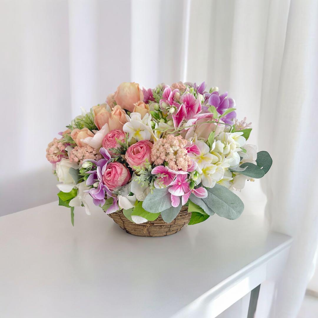 紫陽花が溢れ咲く可愛らしいバスケットアレンジメントの完成です。