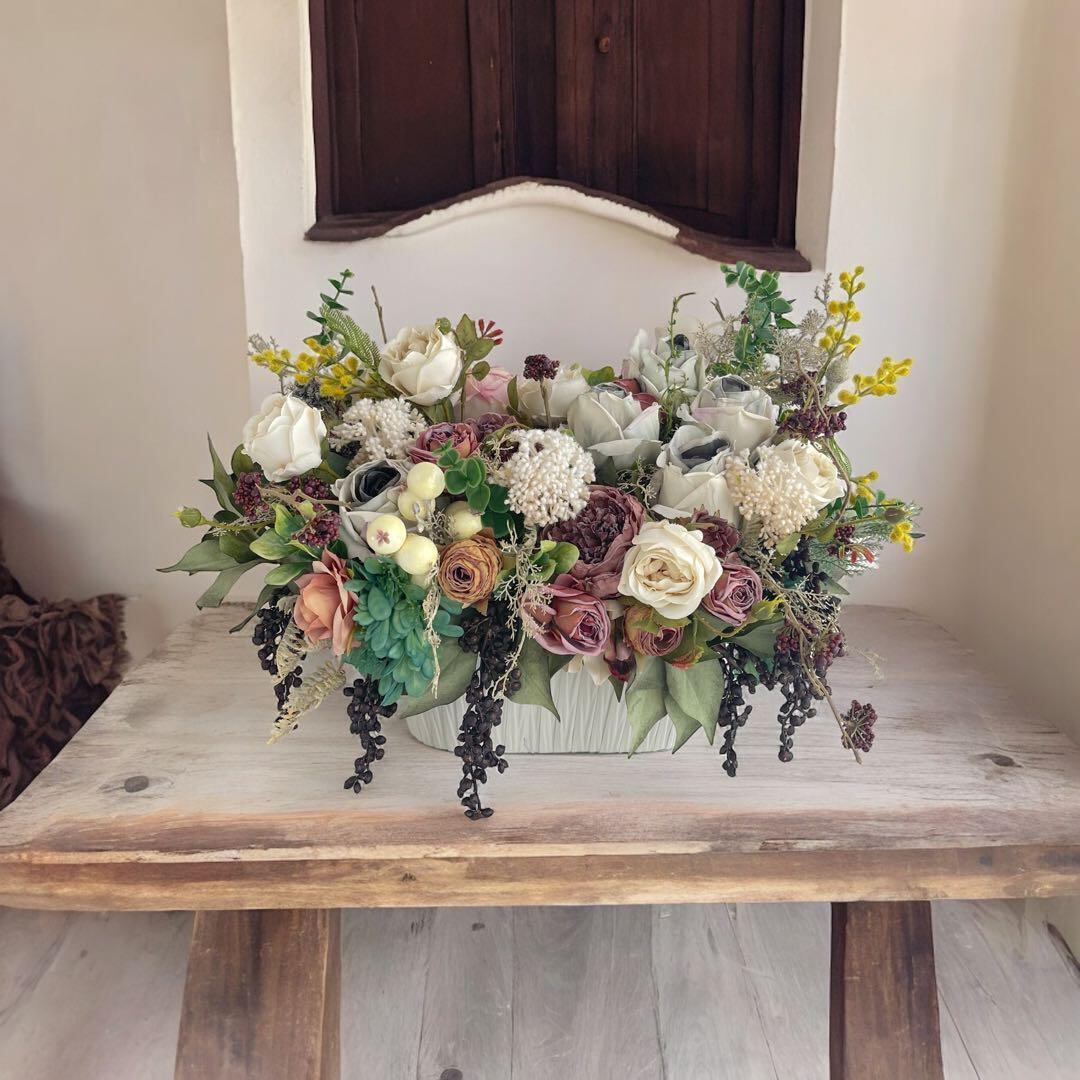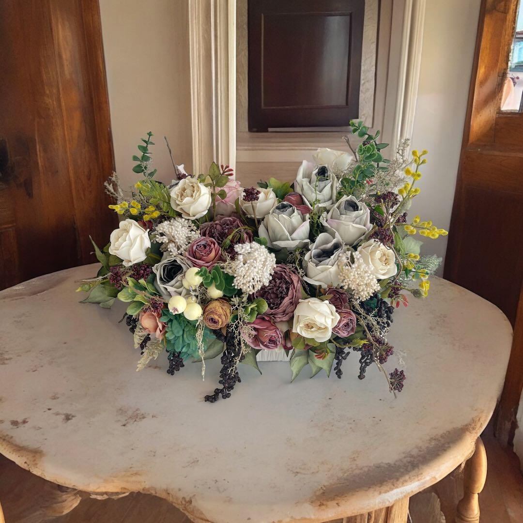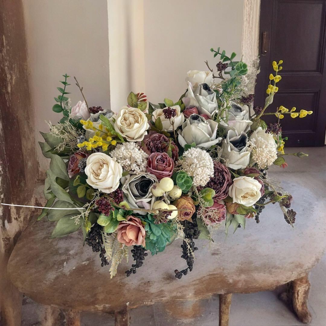 厳選されたアーティフィシャルフラワーを組み合わせており、アッシュグレーやグレージュやボルドーなどのシックな色合いをバランスよく配置し、ヴィンテージテイストに仕上げました。