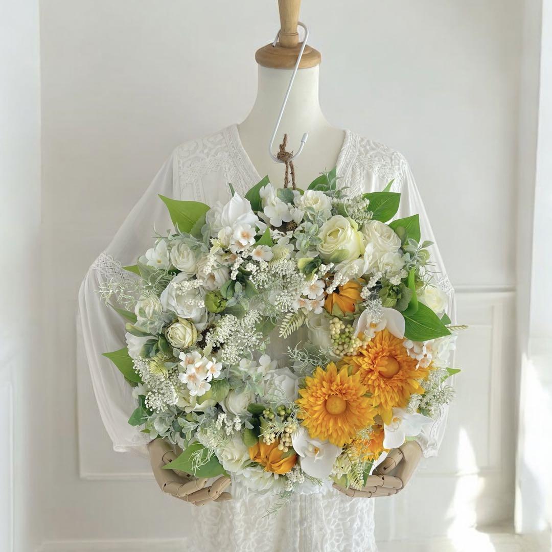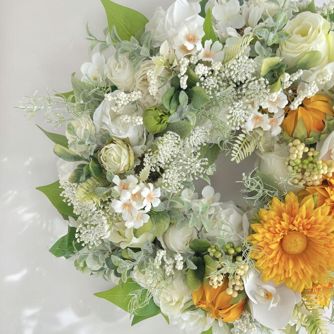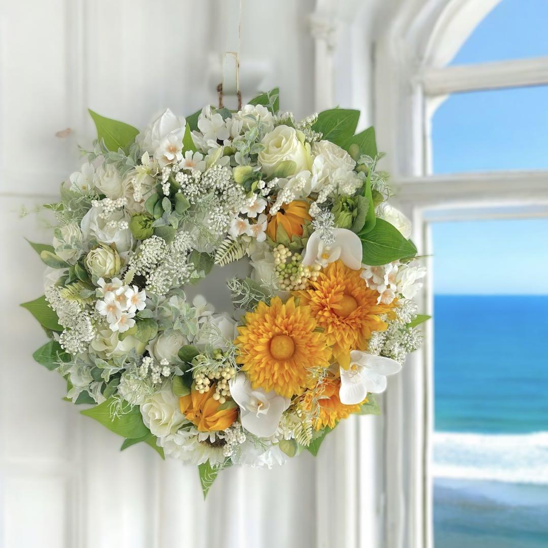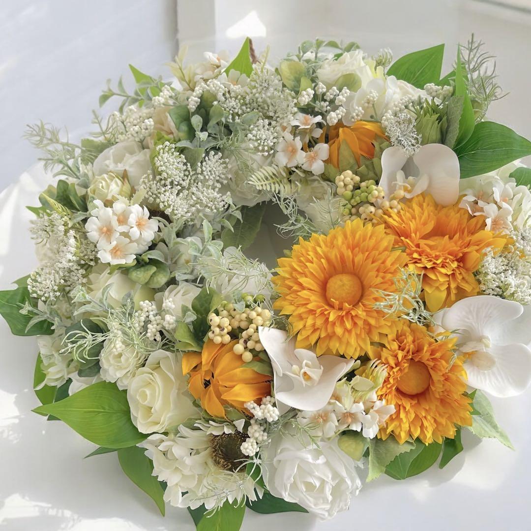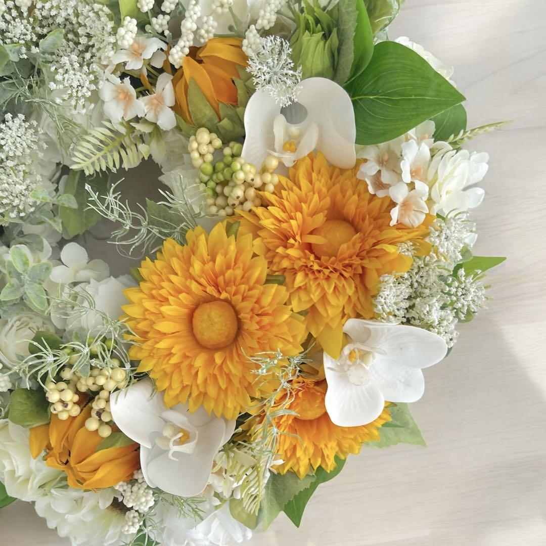 夏の爽やかさを感じさせるアーティフィシャルフラワーの大きめサイズの向日葵のフラワーリースです。