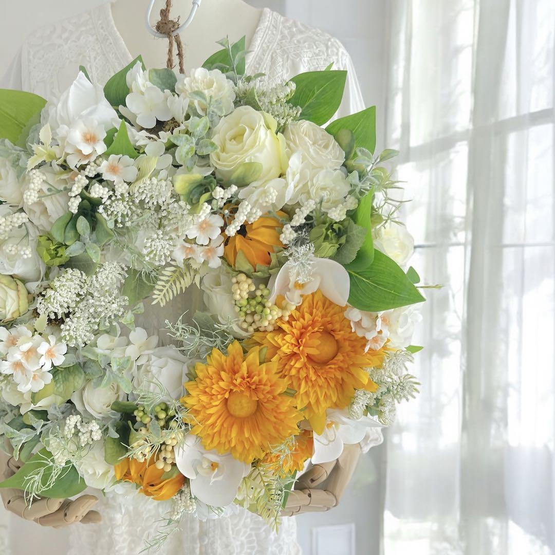 ひまわりの鮮やかな黄色とローズの純白が絶妙に調和し、インテリアとしても季節感を演出してくれます。