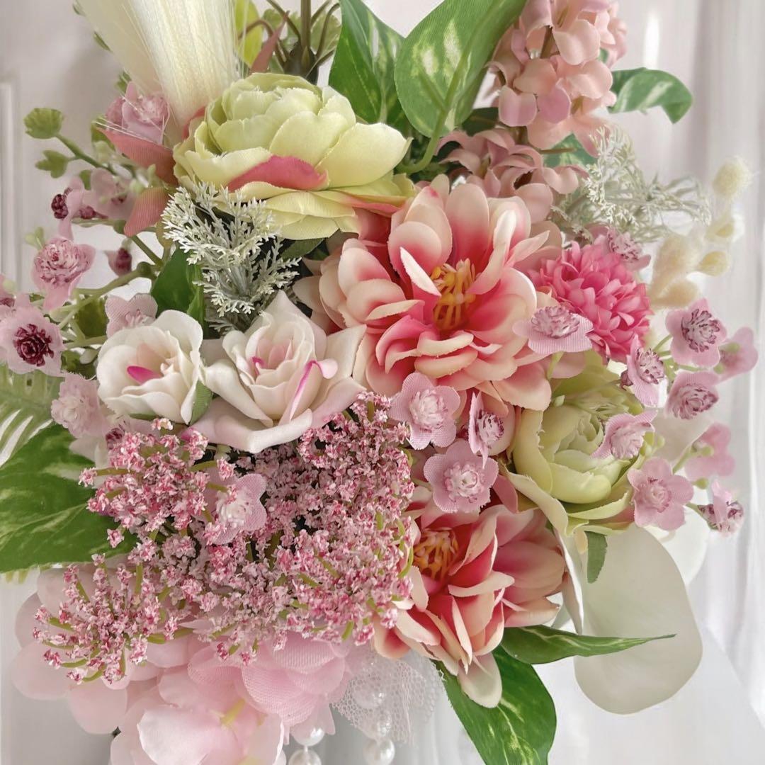 繊細に配置されたピンクやホワイトの花々が、まるで本物のように生き生きとした表情を見せ、優雅な魅力を放ちます。