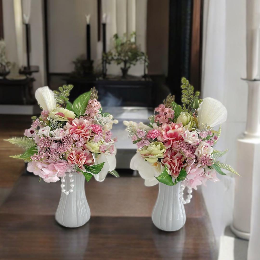 心安らぐ優美な空間を演出する、見る人の心を捉える可愛らしさと、上品な雰囲気をかねそろえた対のアレンジメントです。