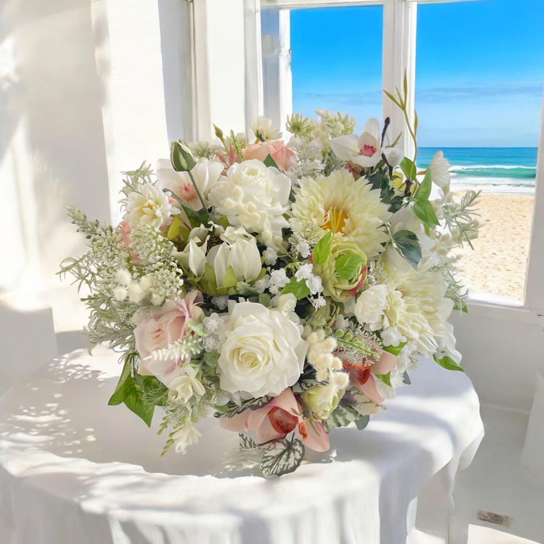 向日葵だけでなく、グリーンや薔薇、多彩な小花達もナチュラルに咲かせ、緑の葉と小花たちが織りなす爽やかなコントラストが、全体に優雅な雰囲気を醸し出します。