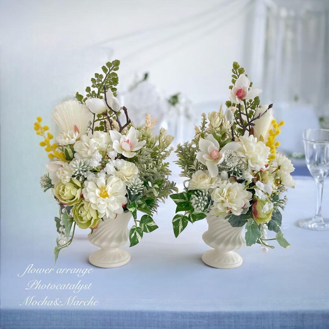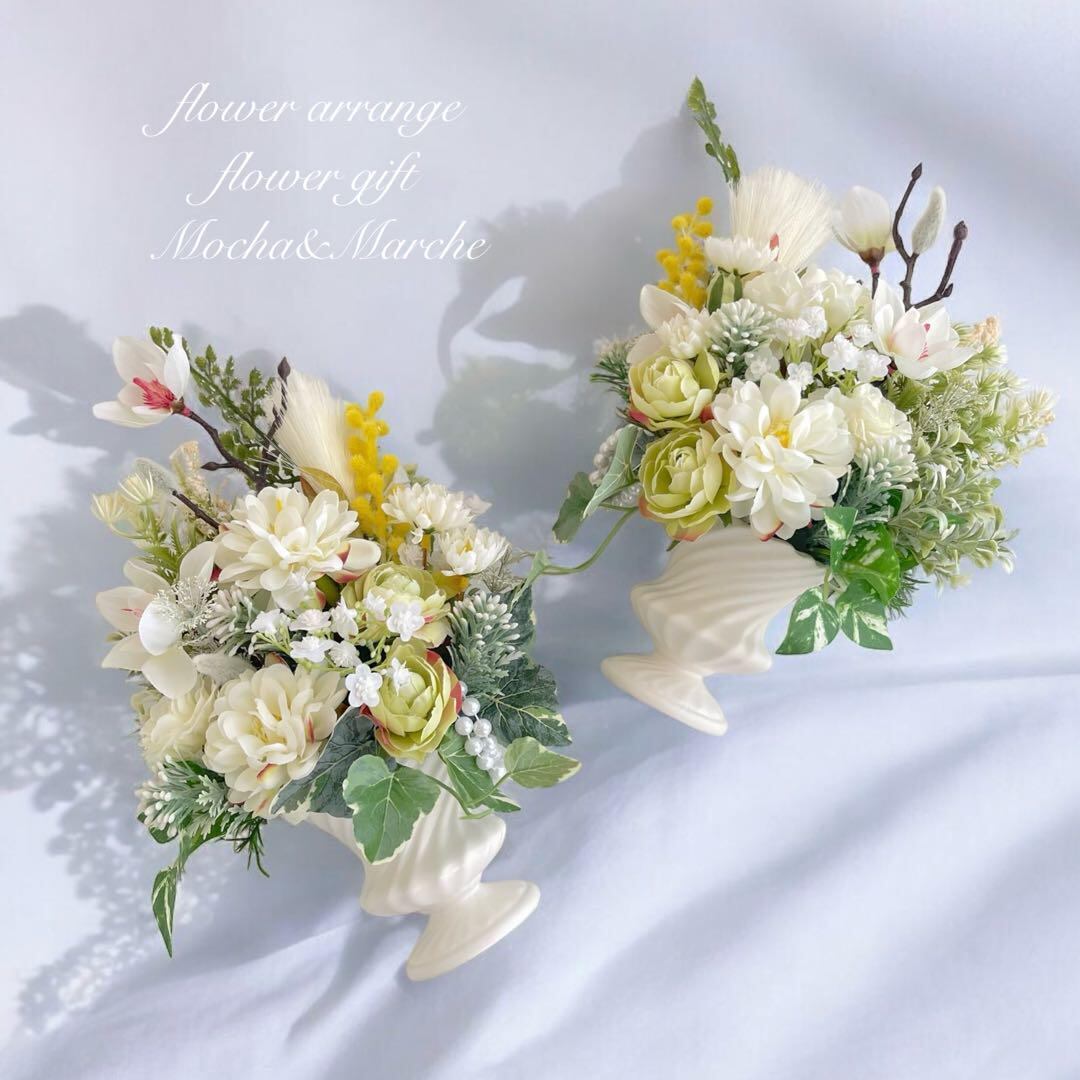 柔らかなホワイトとグリーンが織り成す爽やかな対のフラワーアレンジメントは、日常の空間に優しさと上品さを添えてくれます。