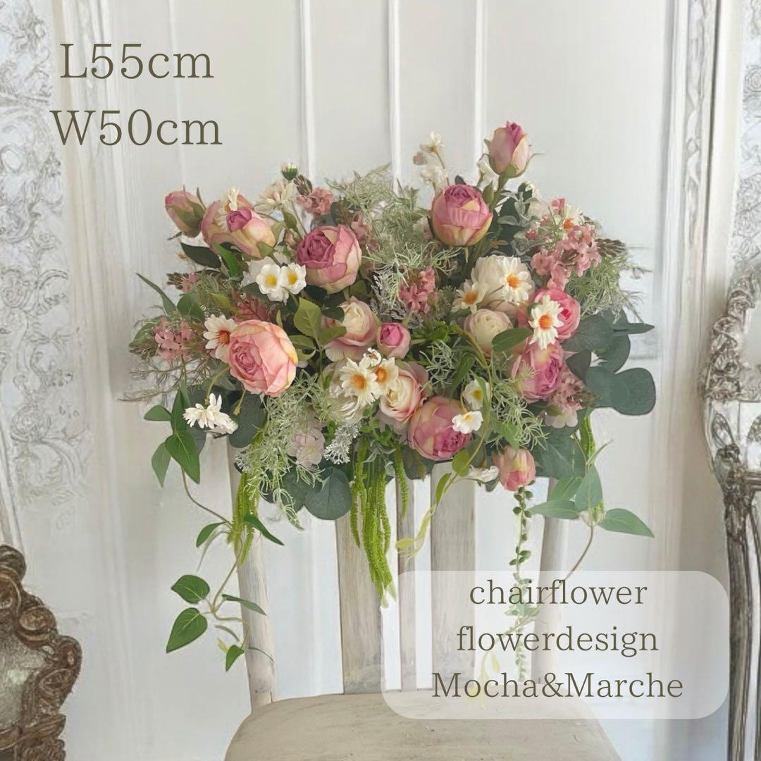 優美なカップローズが咲き誇る、椅子に飾れるオシャレな夢あふれるデザインのフラワーアレンジメントの完成です。