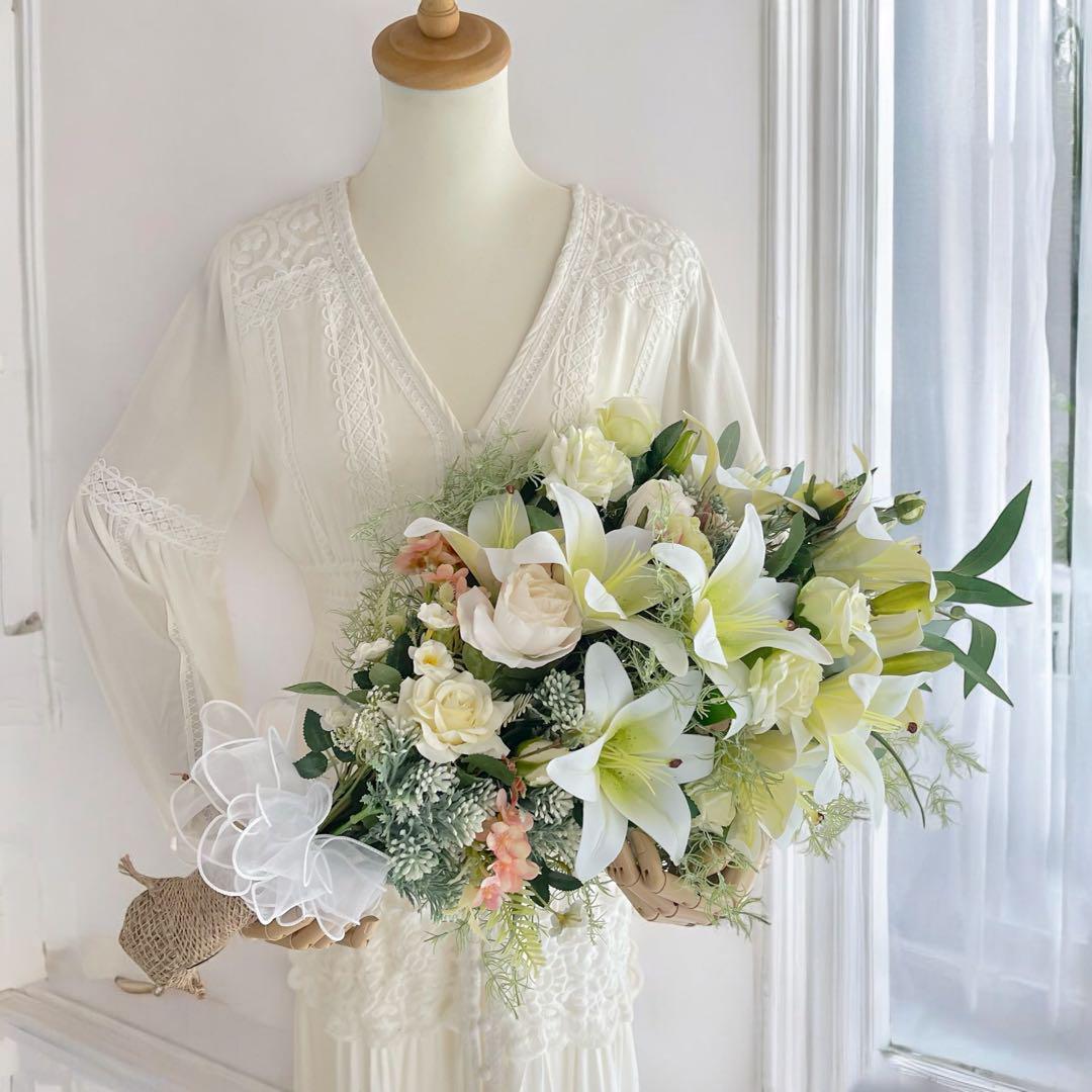 清らかなホワイトリリーと優雅なローズが見事に調和し、どこか神聖でありながら、穏やかで心が癒される空間を演出します。