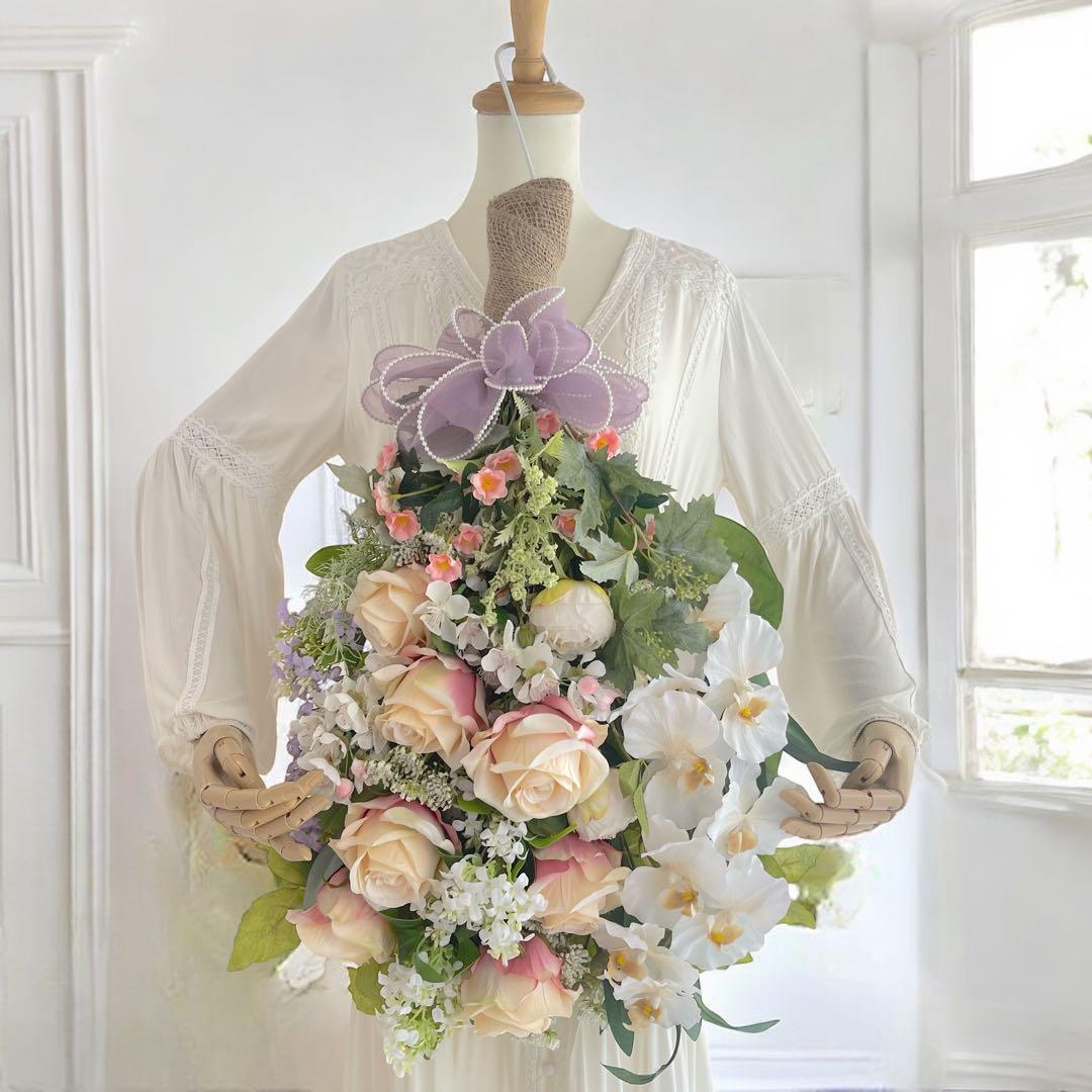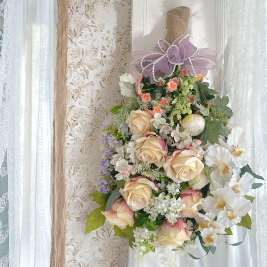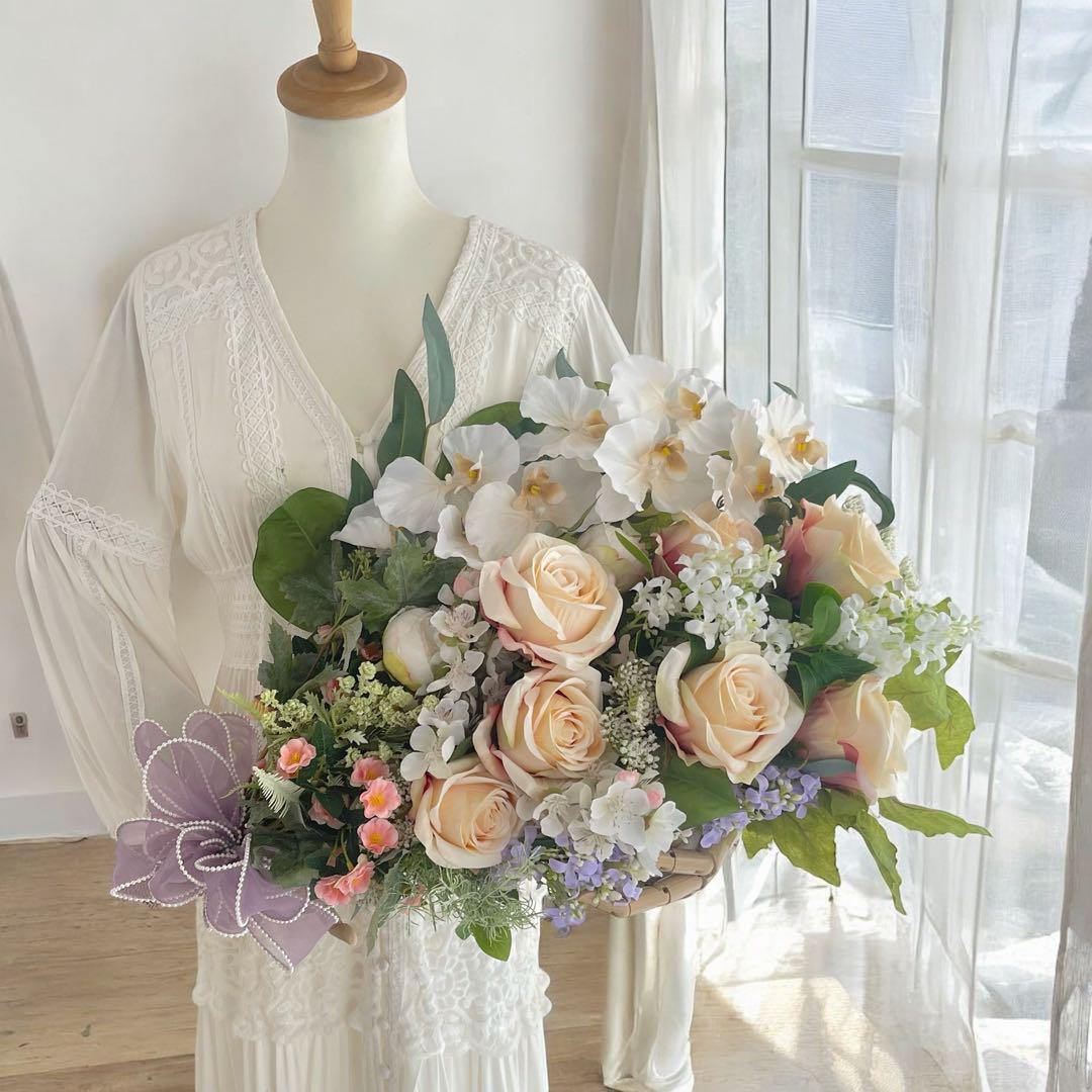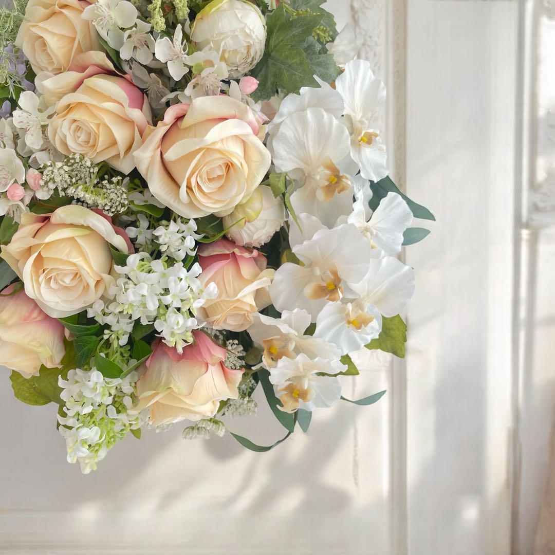 オールドローズと胡蝶蘭が重なり合い、まるで本物の花束のように上品で華やかな彩りを放ちます。