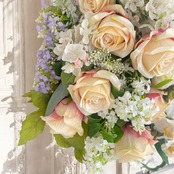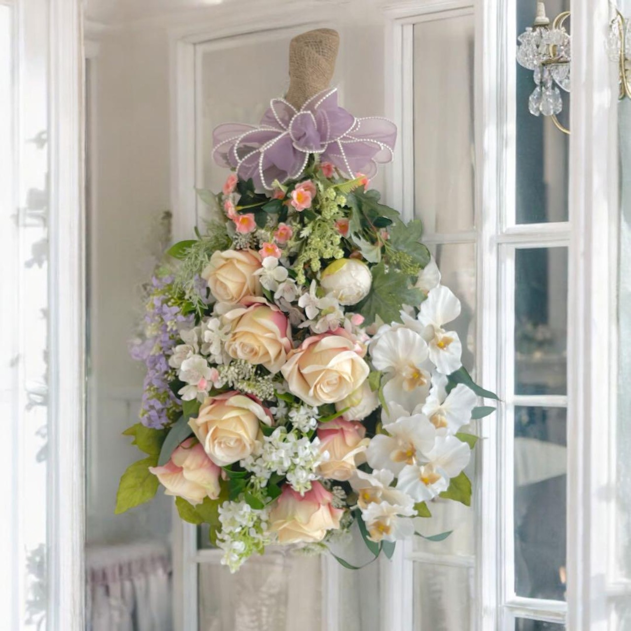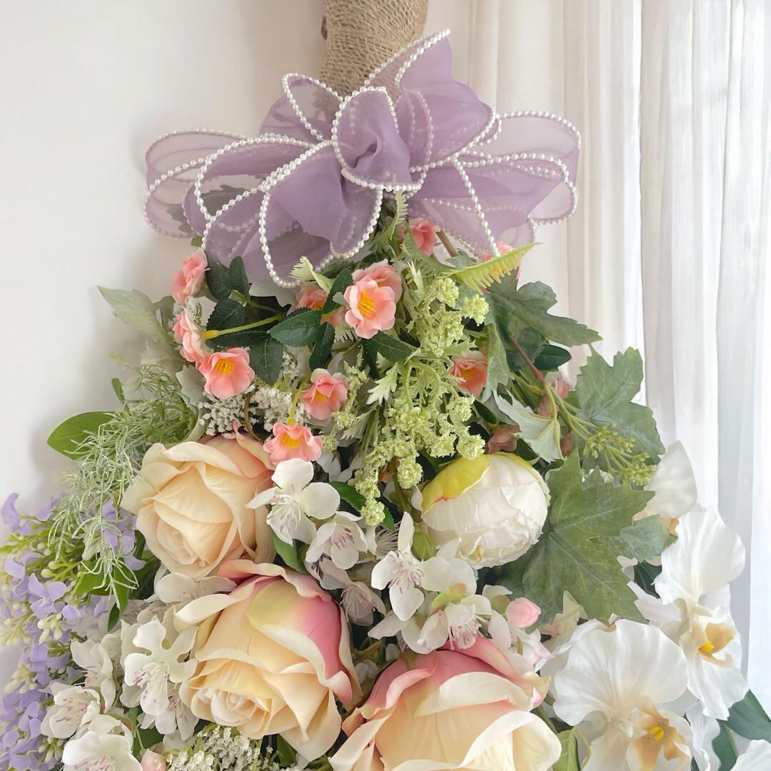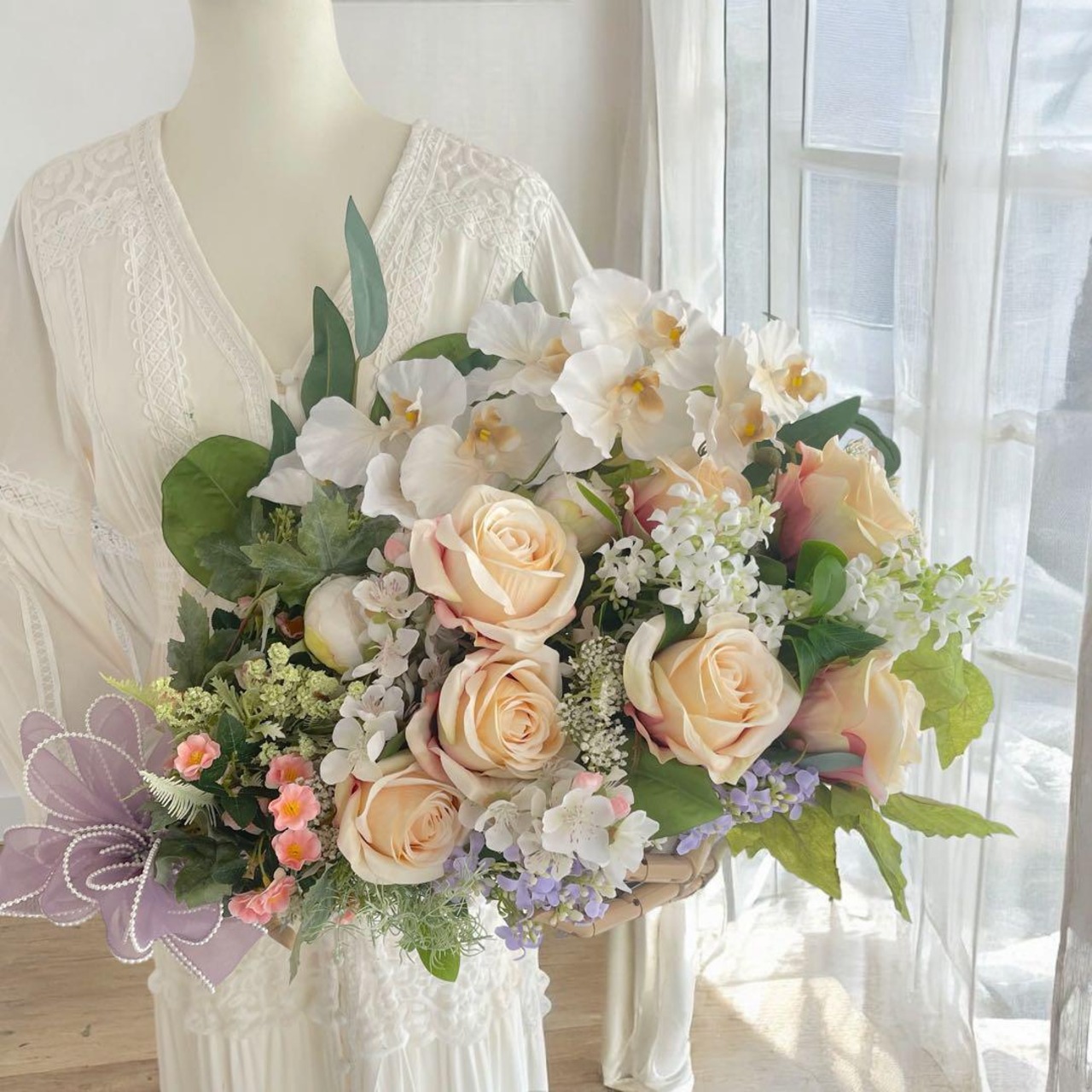 オールドローズと胡蝶蘭が重なり合い、まるで本物の花束のように上品で華やかな彩りを放ちます。