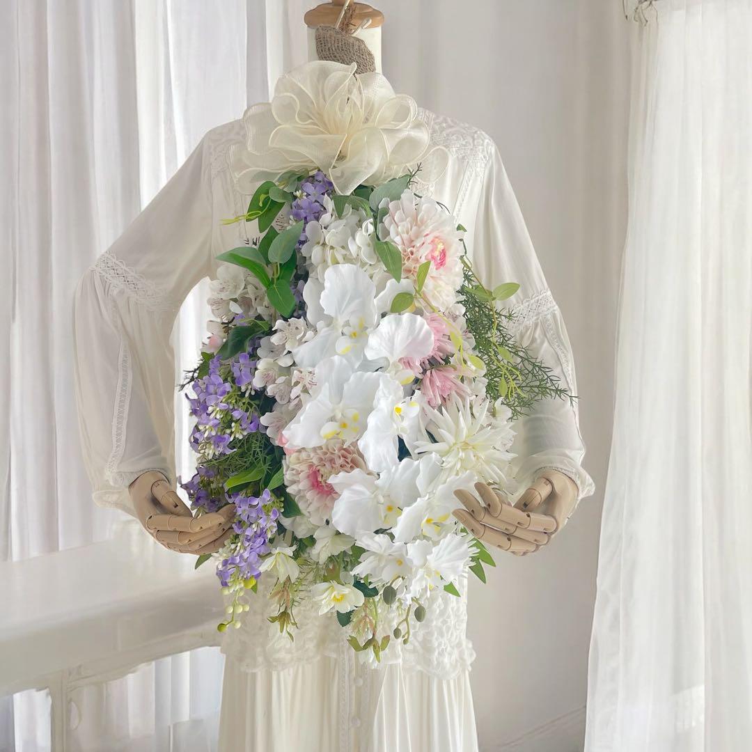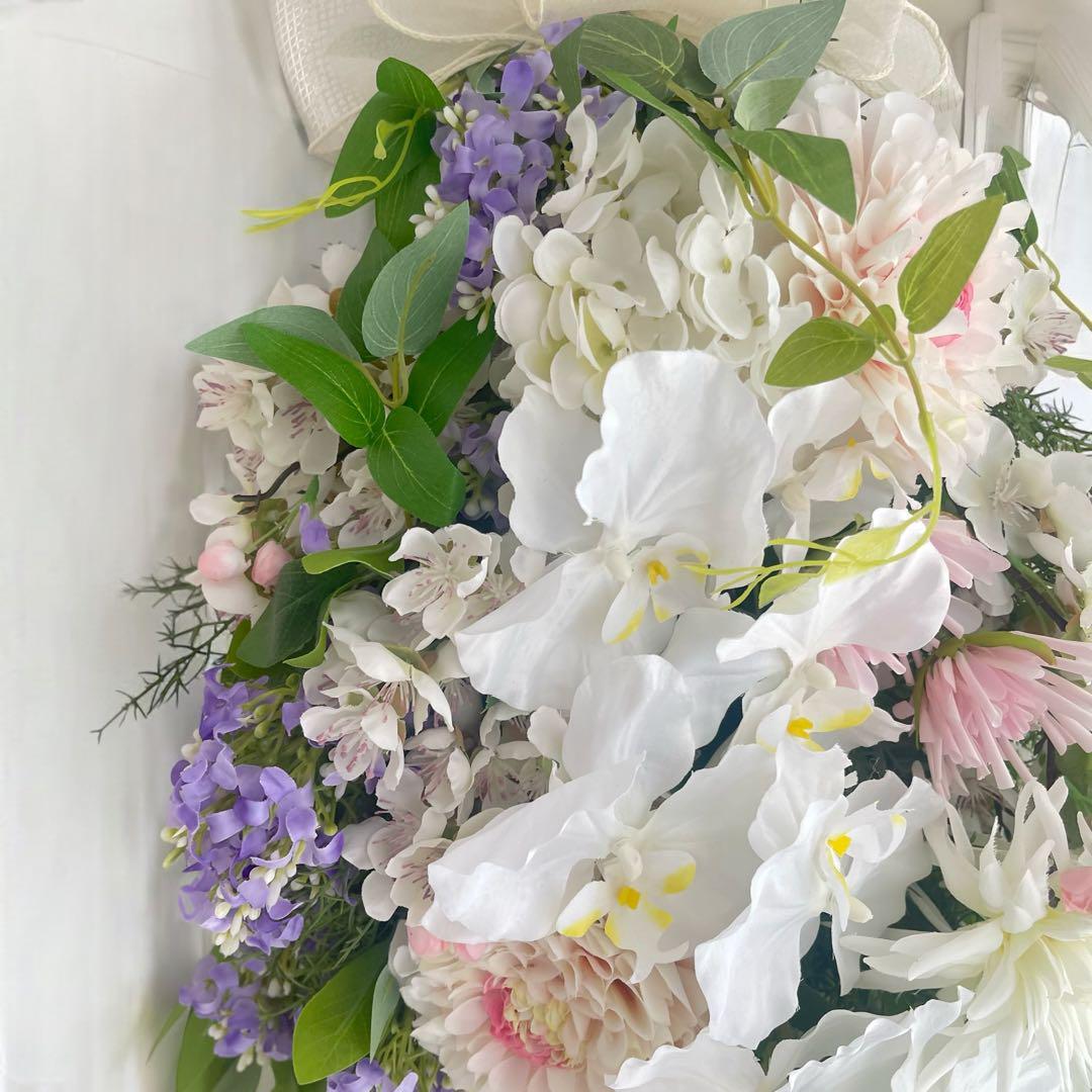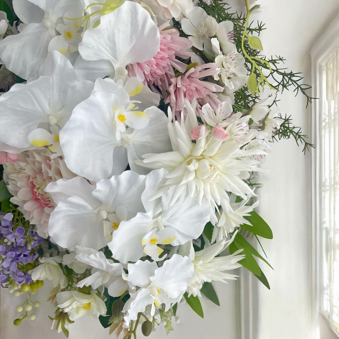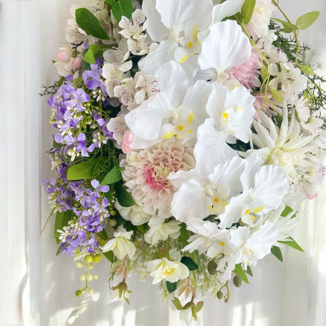 華やぎの胡蝶蘭と四季折々の花々が華麗で優美なスワッグが完成しました。