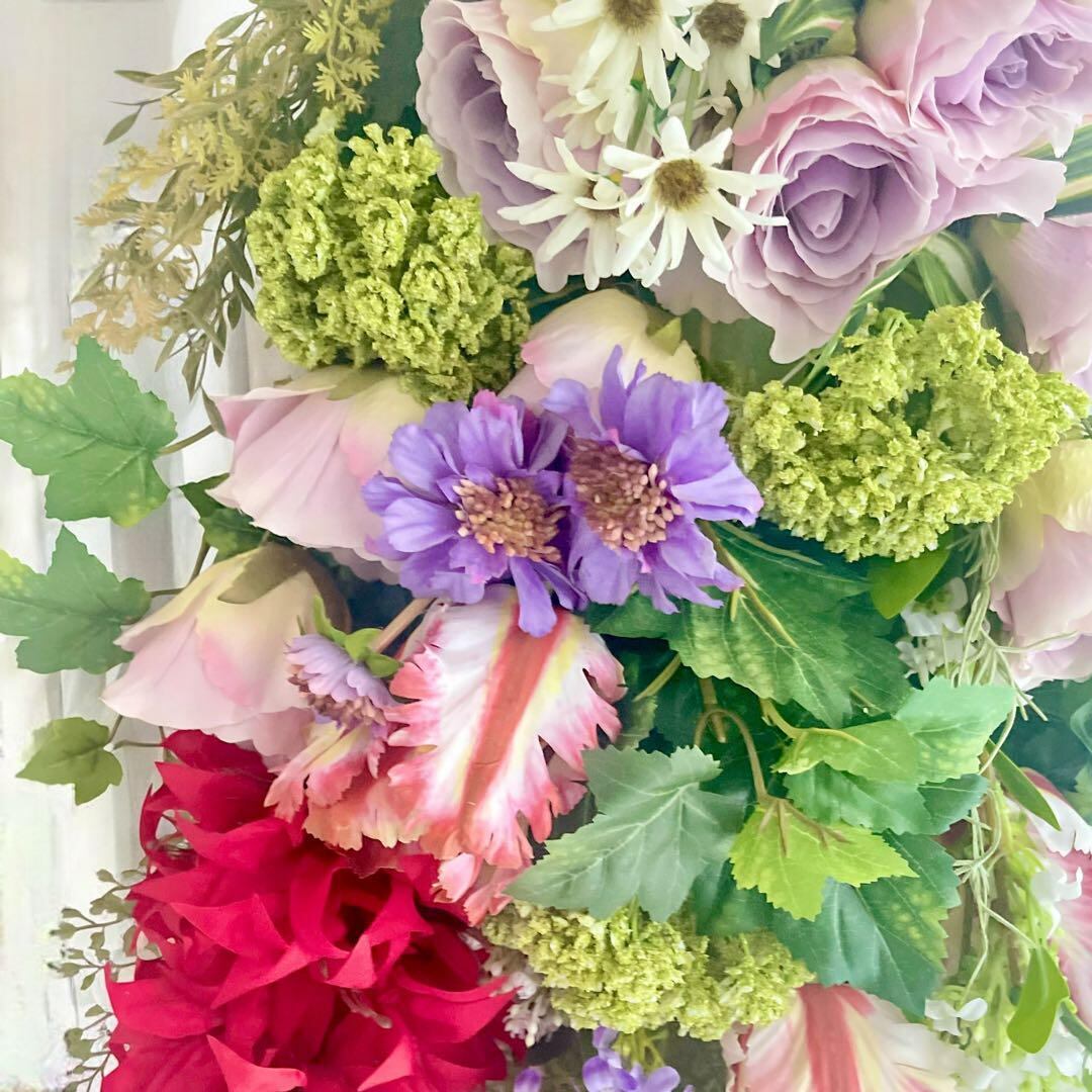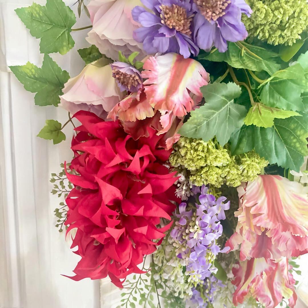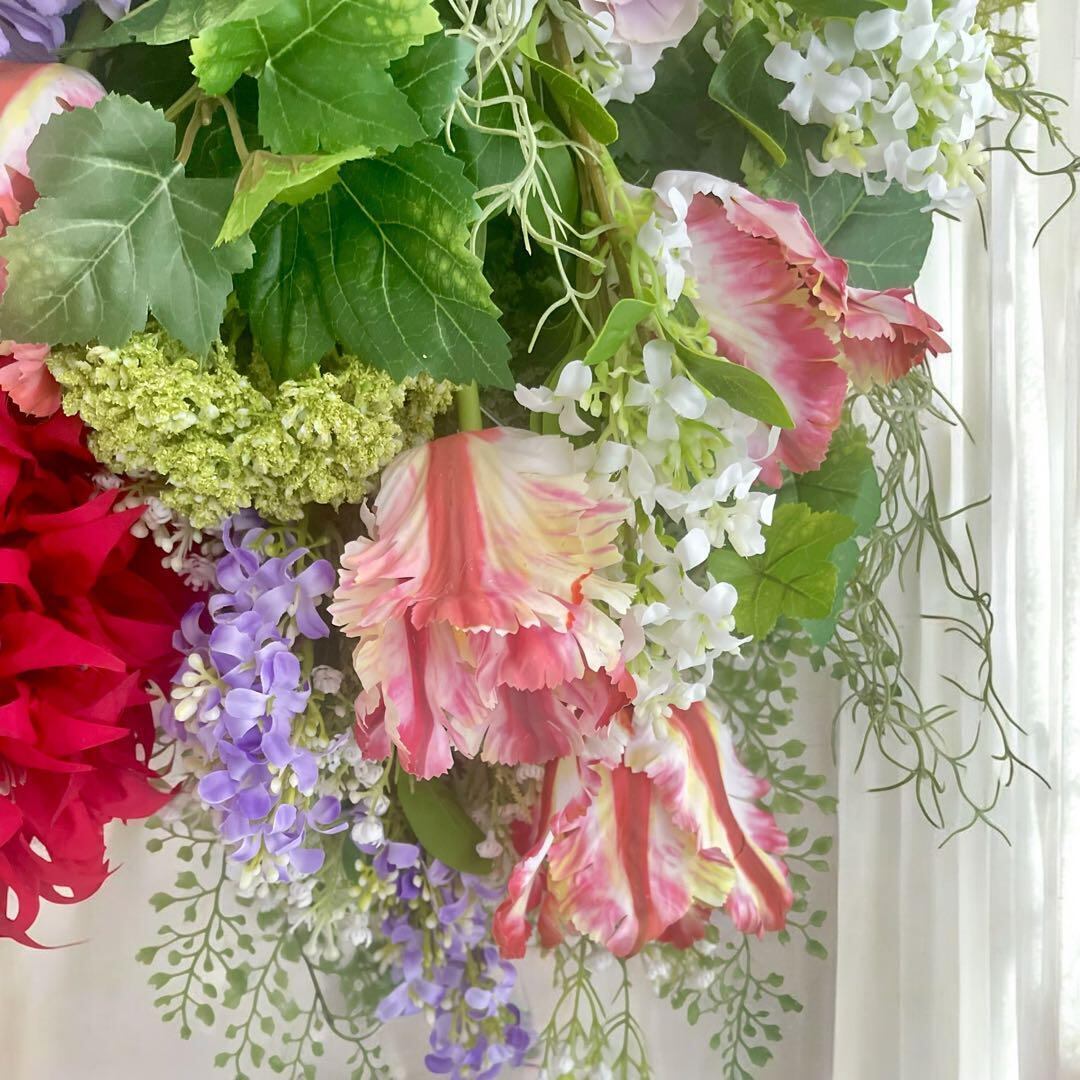 春の訪れを心待ちにしているあなたにぴったりの、華やかでボリュームたっぷりなフラワースワッグが完成しました。