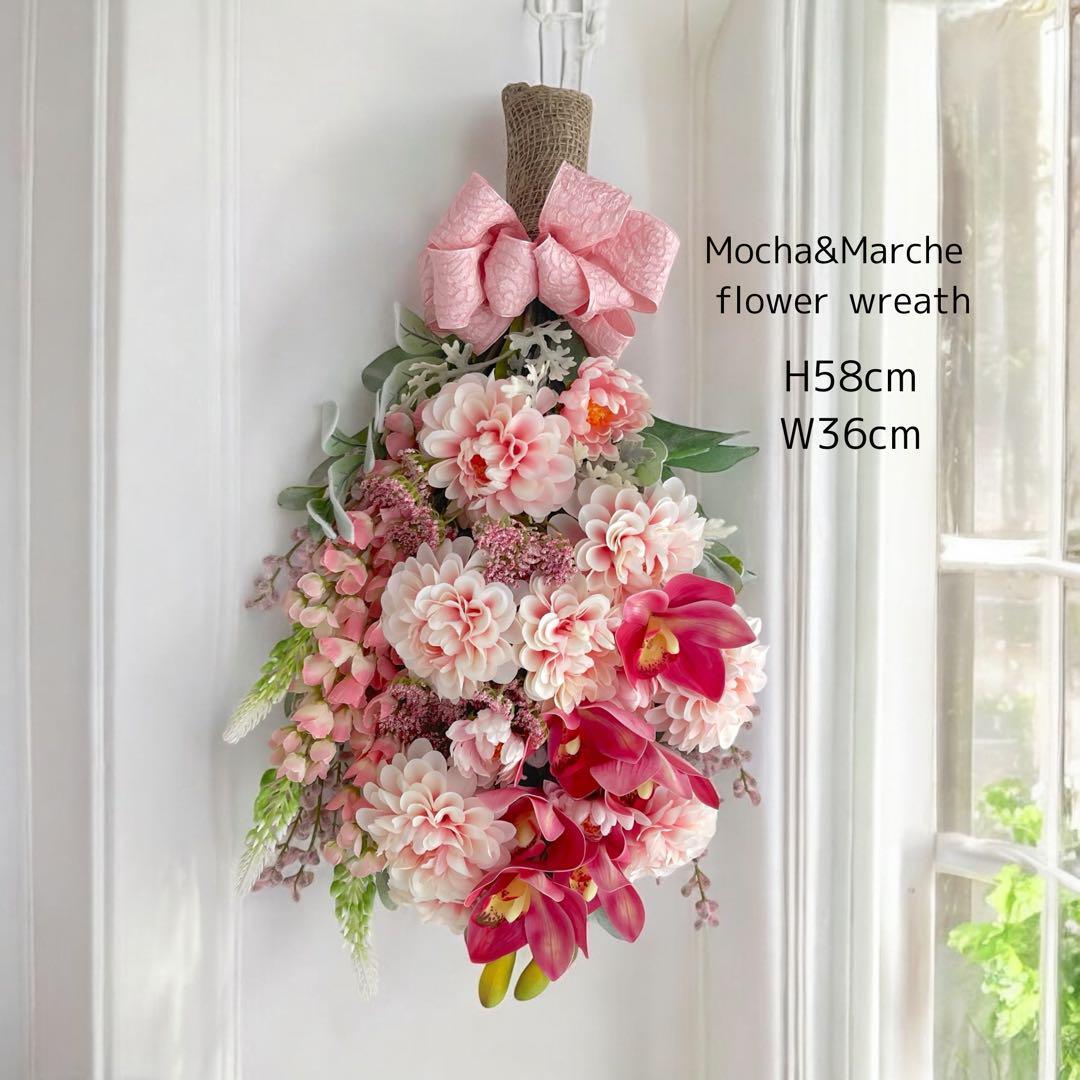 可愛らしい姫ダリアに、ふんわり優しいストック、繊細なレースフラワー、春らしいピンクのミモザ、上品なデンドロビウムを贅沢に使用したアーティフィシャルフラワーのスワッグです◌ ͙❁˚
