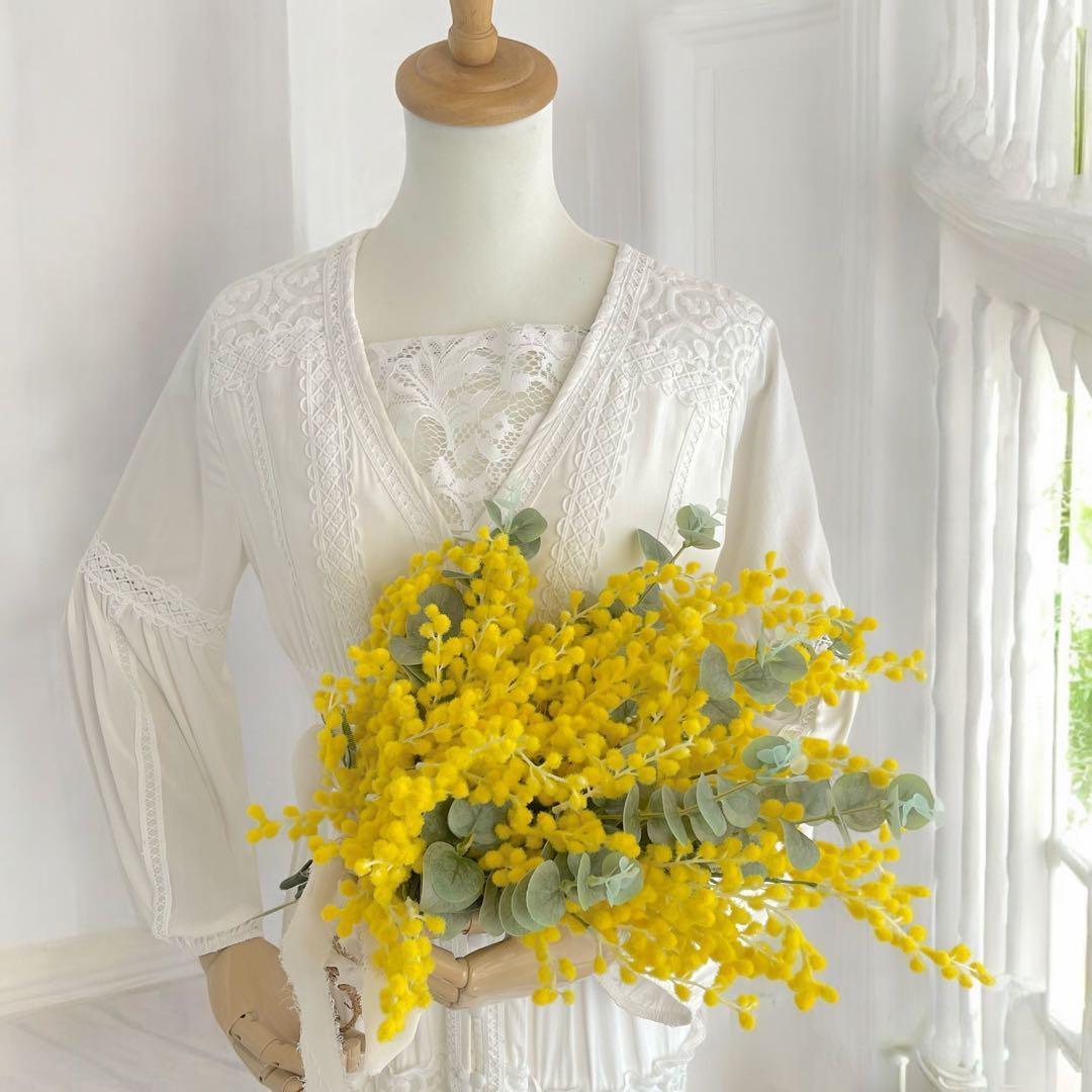 ボリュームたっぷりのミモザに、ナチュラルなユーカリを合わせ、ふんわりと優しいリネンのリボンで仕上げました。壁に飾るだけで、まるで陽だまりの中にいるような癒しの空間に。リビングや玄関、寝室に飾れば、心まで温かく包み込んでくれる特別なスワッグです。