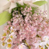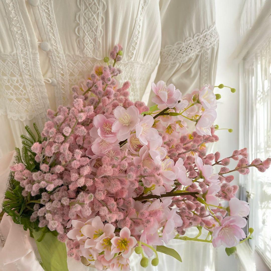 珍しいピンクのミモザがふんわりと広がり、可愛らしい桜がそっと寄り添うように咲き誇ります。